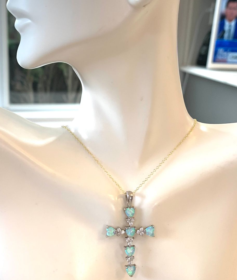.925 Sterling Silver Chain & 18k Gold Overlay Cross 3.75 ctw Opal & Diamonique Diamond Necklace