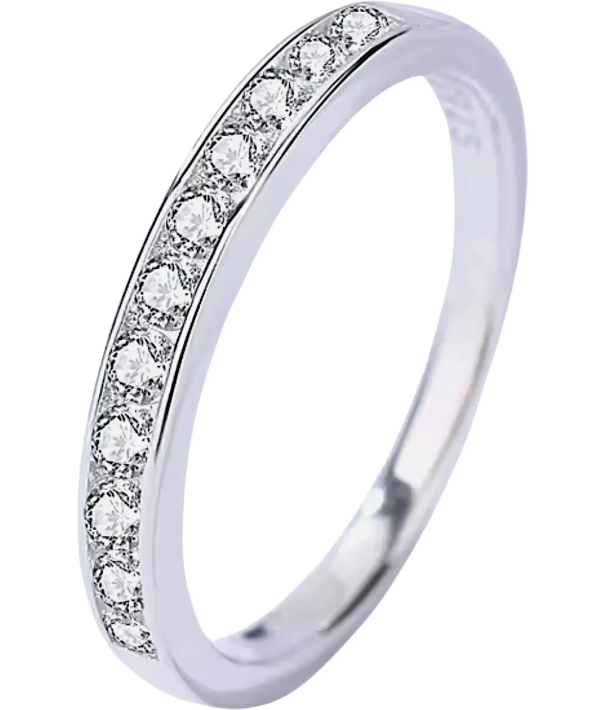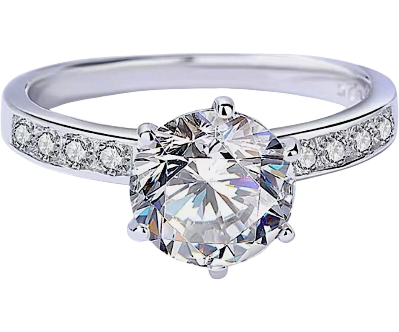 This Moissanite is Mounted in 925 Stamped Solid Sterling Silver with White Gold Overlay, which gives this Ring its High Polish and Shine.