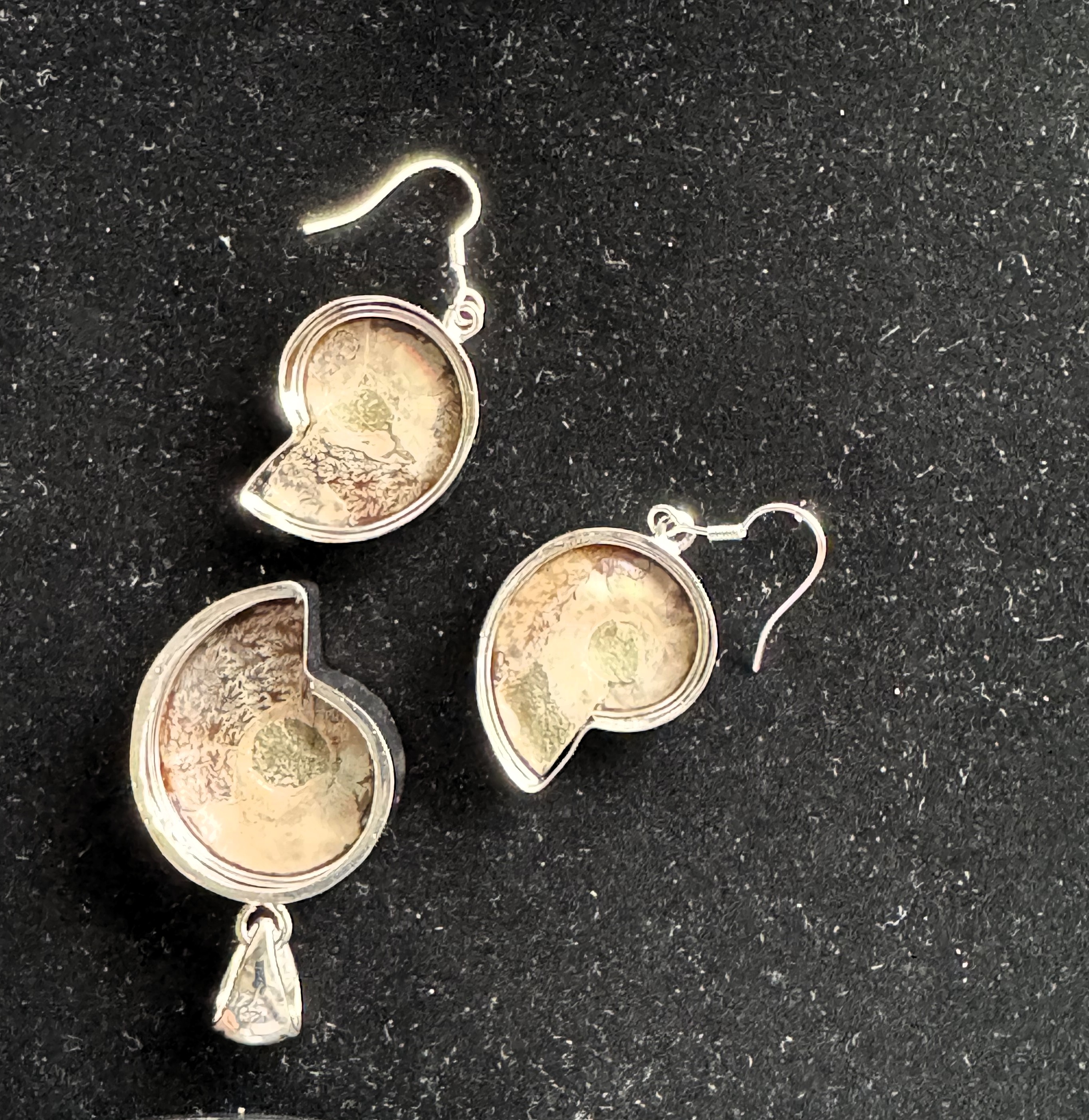 .925 STERLING SILVER VINTAGE MARKED LARGE AMMONITE PENDANT AND MATCHING EARRINGS SET