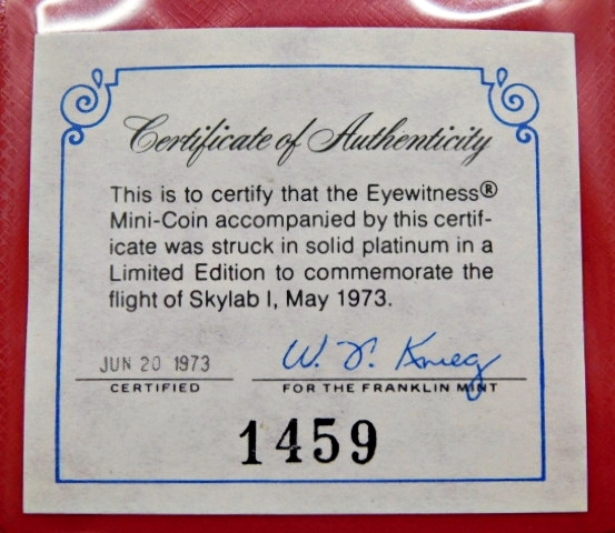 .9999 Fine Platinum 1973 PLATINUM 10mm 1.2 grams Coin - Skylab II Eyewitness Mini Coin - Struck by the Franklin Mint to Commemorate Skylab I - In Small Red Wallet