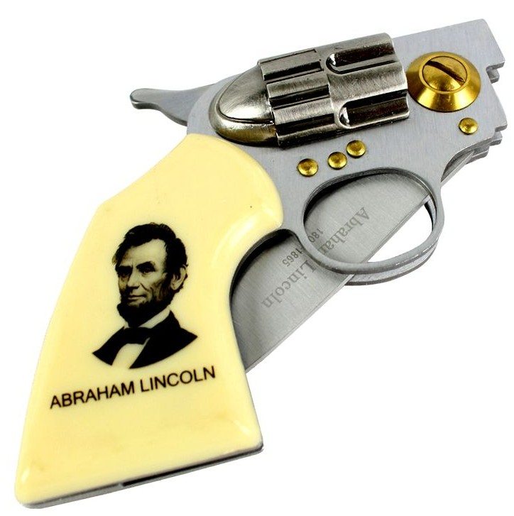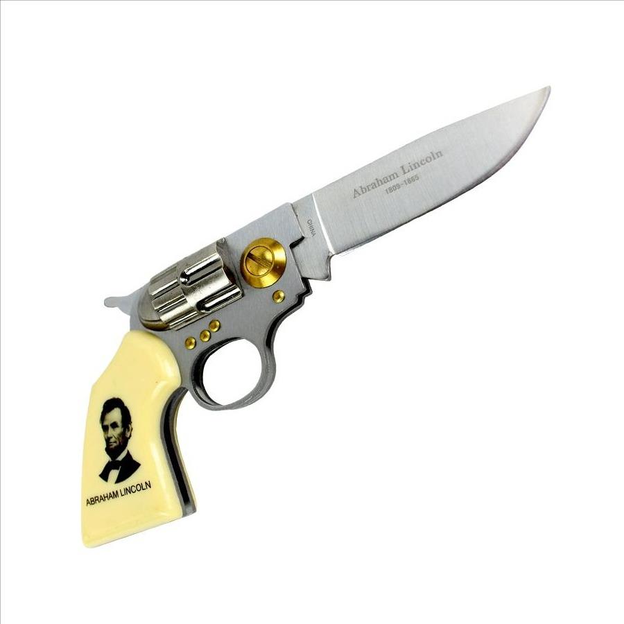 This Abraham Lincoln Gun Knife is handsome folding pocket knife features a stainless steel blade, with a picture of 16th American President Abraham Lincoln. Knife is custom mounted in a deluxe srtylish box.