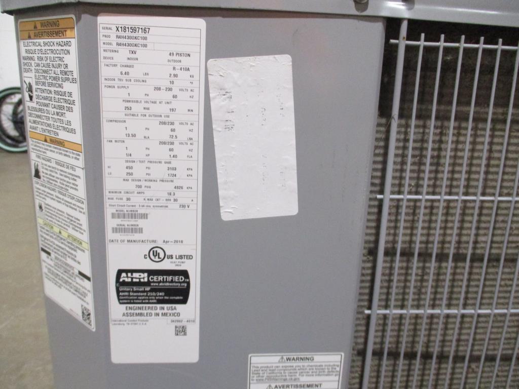- manufactor date April 2018, outdoor unit, factory charge, 6.0LBS, indoor subcooling, power supply, 208 230 VAC, 60HZ, permissible voltage 253 max and 197 min, compressor voltage 208,230 vac, 60HZ, single phase, 13.5 RLA, 72.5LRA, fan motor, 208,230 vac and 60HZ, single phase, design test pressure guage, HI 450 PSI, Low 250 PSI, 3103 KPA, 1724 KPA, max design working pressure, 700 PSI, 4826 KPA