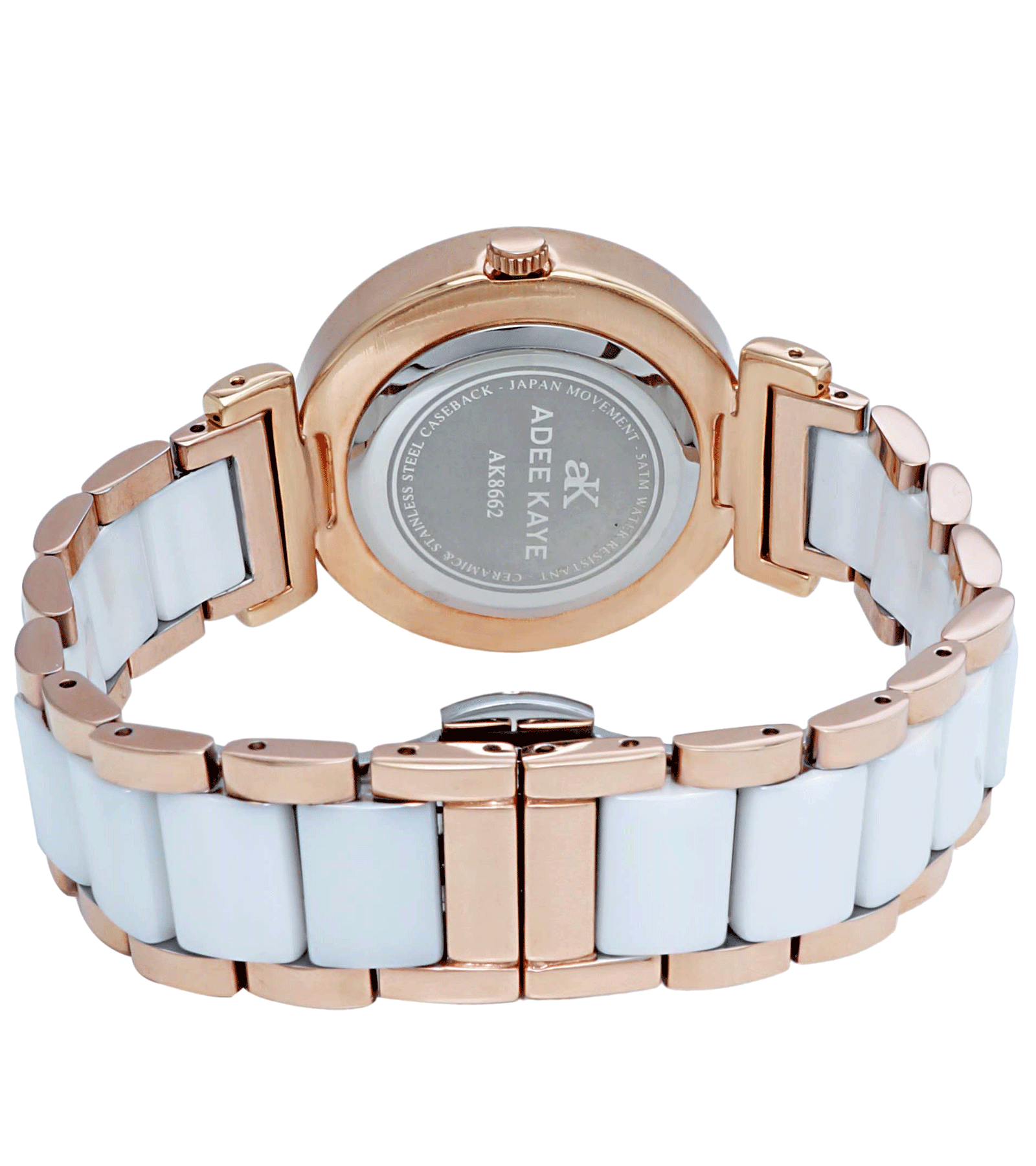 ADEE KAYE LADIES, WHITE HIGH -TECH CERAMIC, ROSE TONE STAINLESS STEEL CASE, WHITE MOP DIAL WITH WHITE STONE, MSRP: $495.00