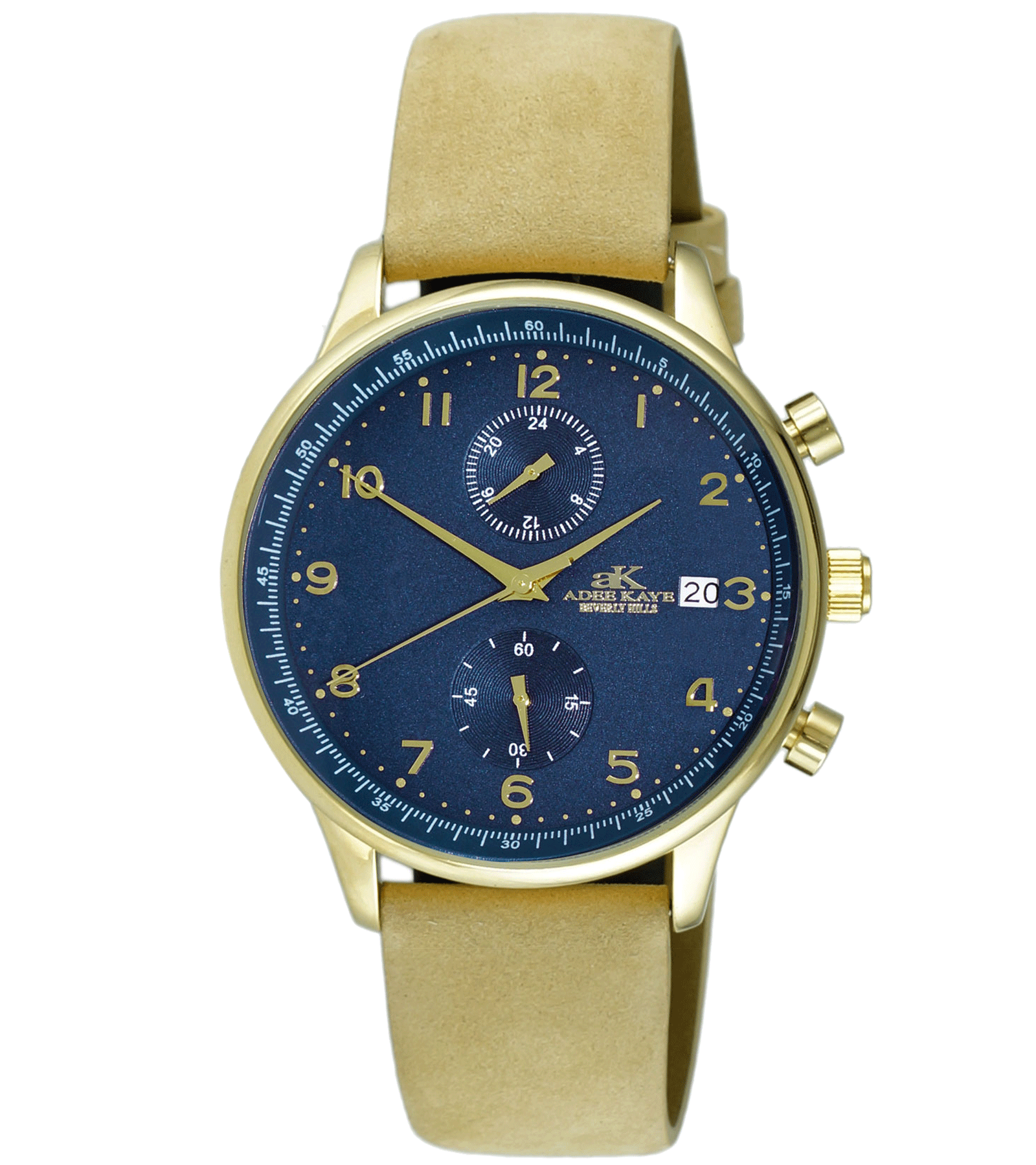 ADEE KAYE WATCHES, DUAL ADEE KAYE TIME OF 24 HOUR REGULATOR, GOLD TONE CASE. AK7501-MGBU-LTAN, RETAIL AT $245.00