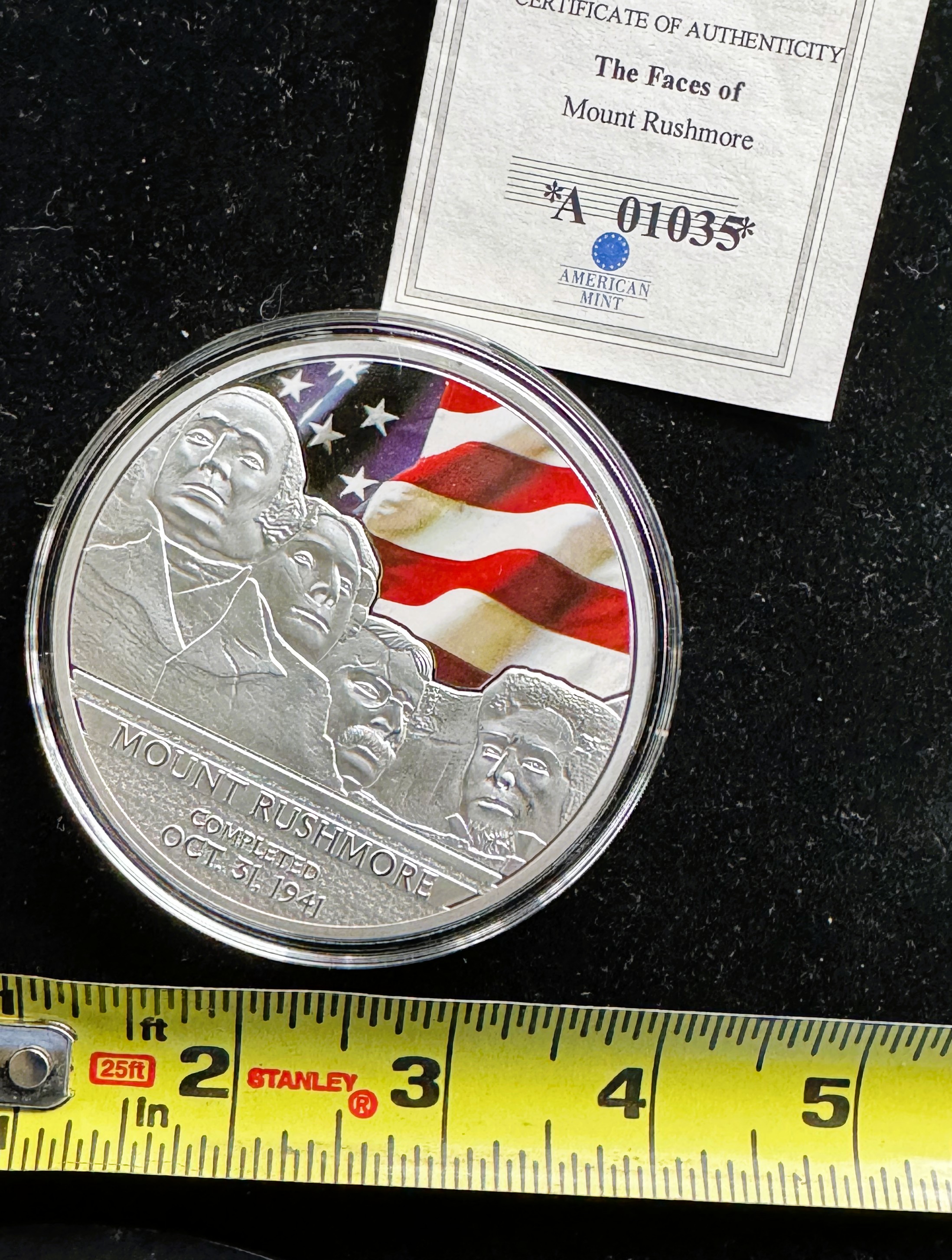 AMERICAN MINT LARGE SPOT GOLD, SILVER PLATED ON SOLID COPPER COIN PROOF, 110g, FACES OF MOUNT RUSHMORE WASHINGTON, UNBLEMISHED IN CAPSULE, COA
