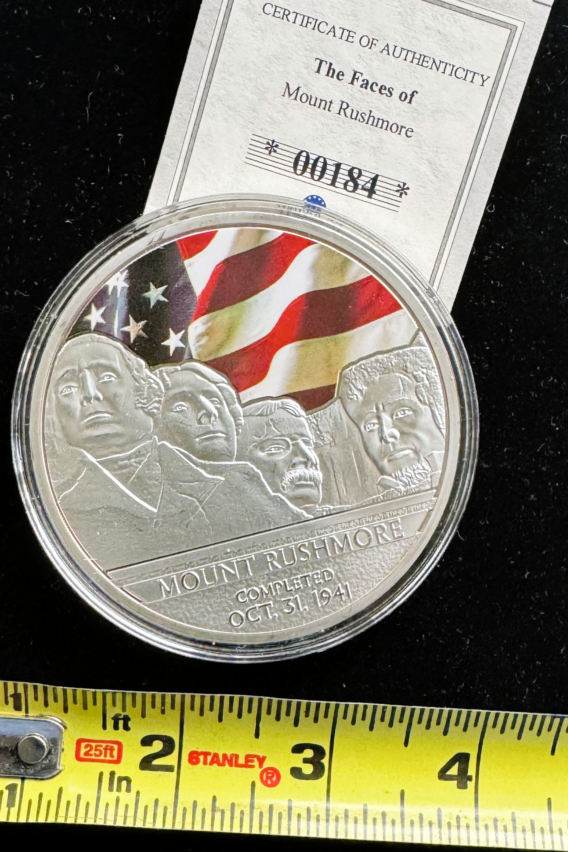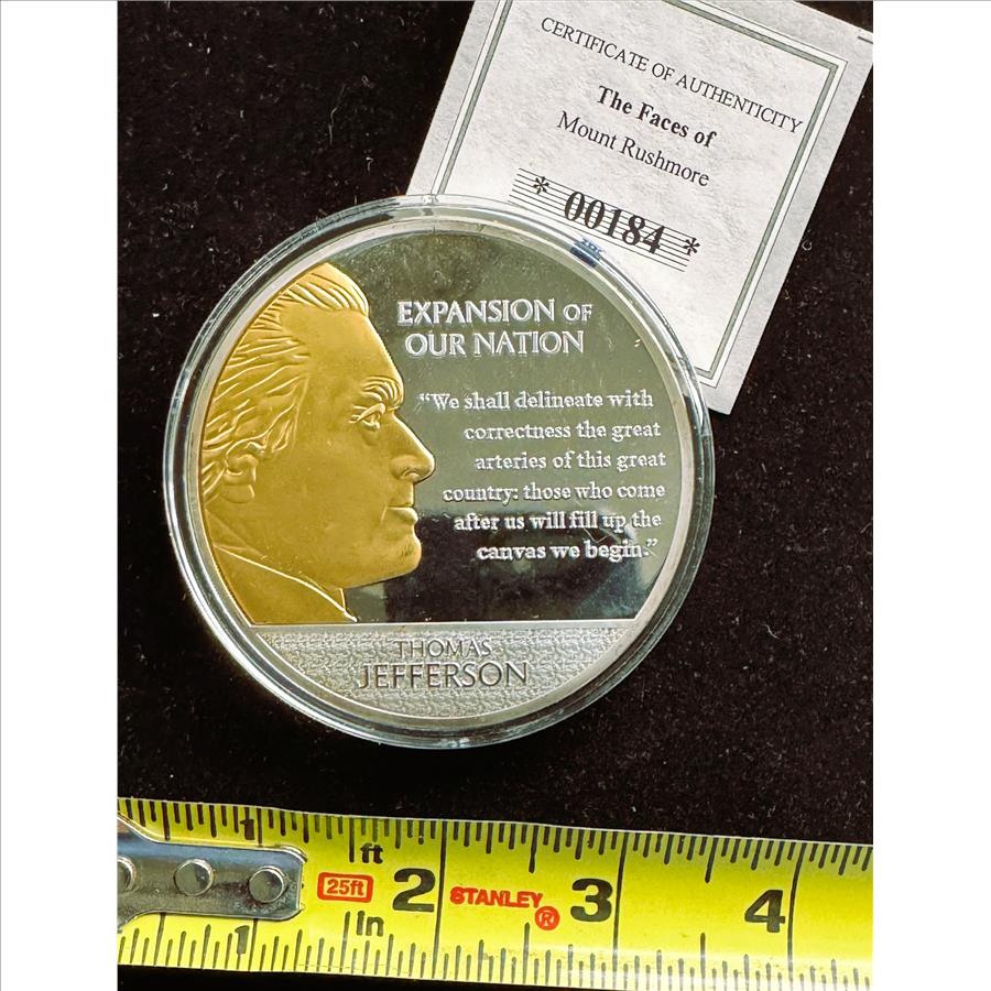 AMERICAN MINT LARGE SPOT GOLD, SILVER PLATED ON SOLID COPPER COIN PROOF, FACES OF MOUNT RUSHMORE JEFFERSON, UNBLEMISHED IN CAPSULE, COA