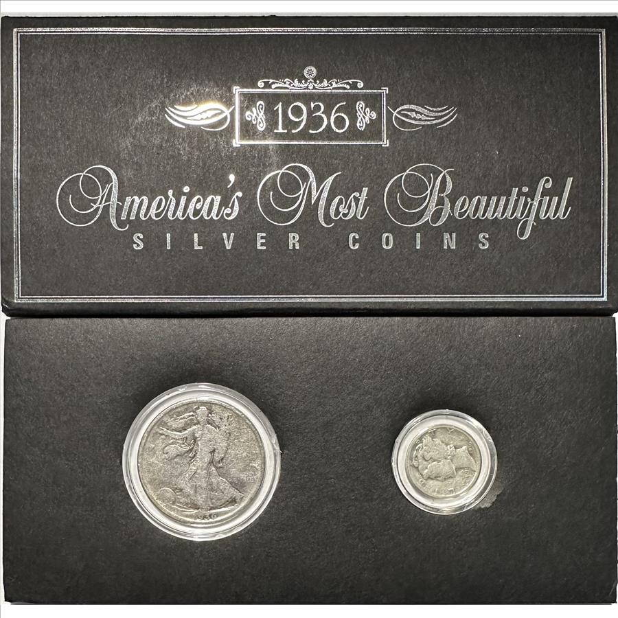 >America's Most Beautiful Silver Coins - U.S. 1936 Walking Liberty Half Dollar & 1936 Mercury Dime - 2 Silver Coins