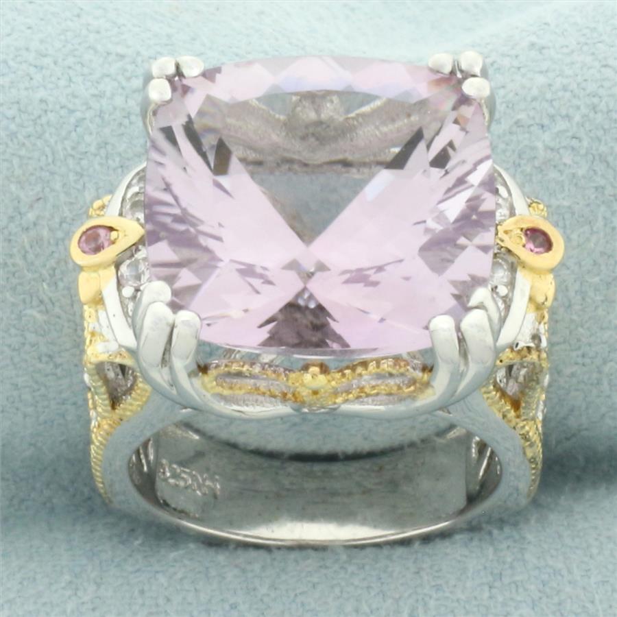 In .925 sterling silver. Contains 1 high quality natural fancy cushion cut 15mm Amethyst gemstone with bright color and excellent clarity Also contains 2 high quality 1mm amethyst gemstones and 8 high quality 1mm white sapphire gems. Size: 6, Euro Shank. 9.8g.