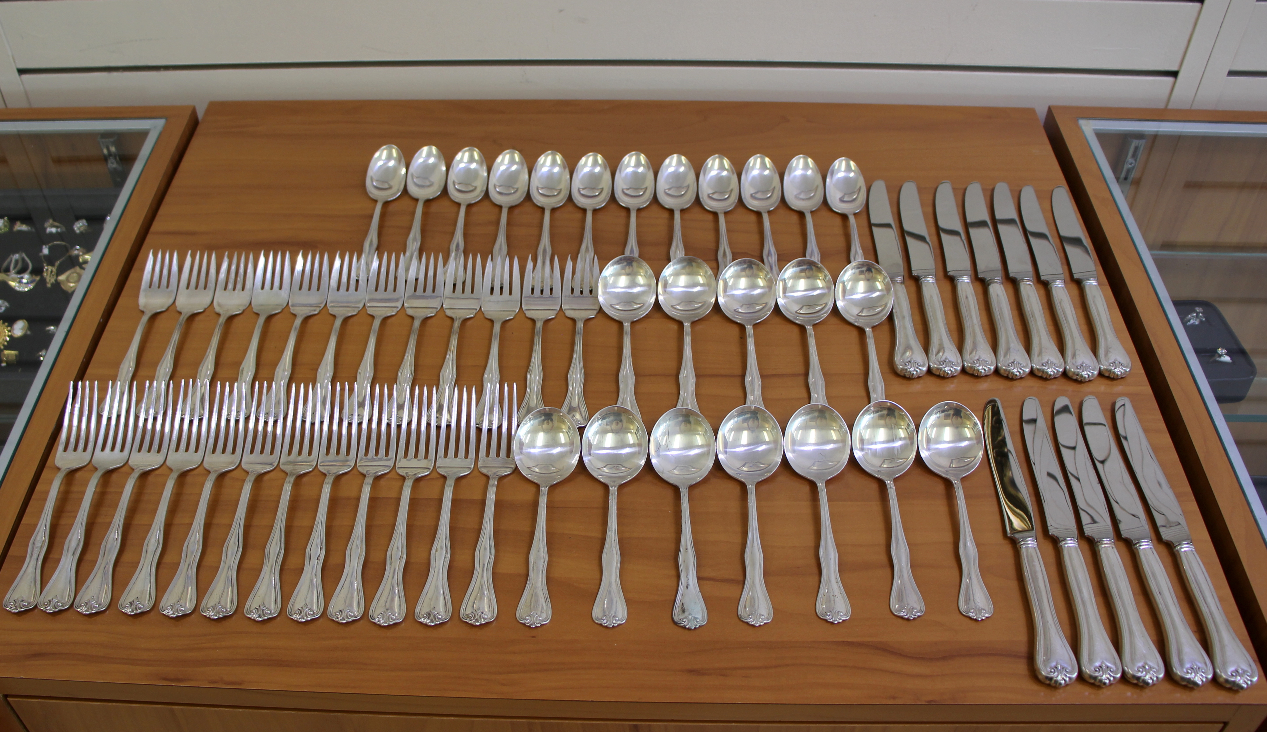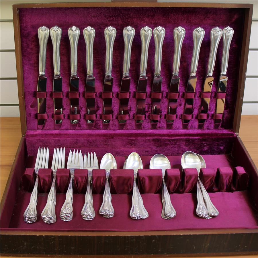 In .925 Sterling Silver. Set includes: twelve forks, 7 1/8 inches; twelve salad forks, 6 1/2 inches; twelve teaspoons, 6 inches;, twelve round bowl cream soup spoons, 6 1/8 inches; twelve new French knives, 9 1/8 inches. Also incudes tarnish resistant wooden storage box. 2,660.4g.