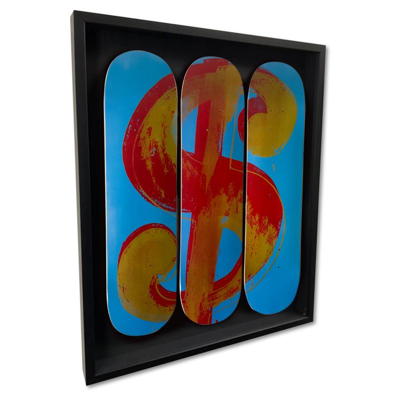 "Dollar Sign" is a skateboard triptych by Andy Warhol (1928-1987), bearing the plate signature of the artist inverso. Includes Letter of Authenticity. Measures approx. 30" x 37" x 3" (frame), 24" x 32" (skateboards).