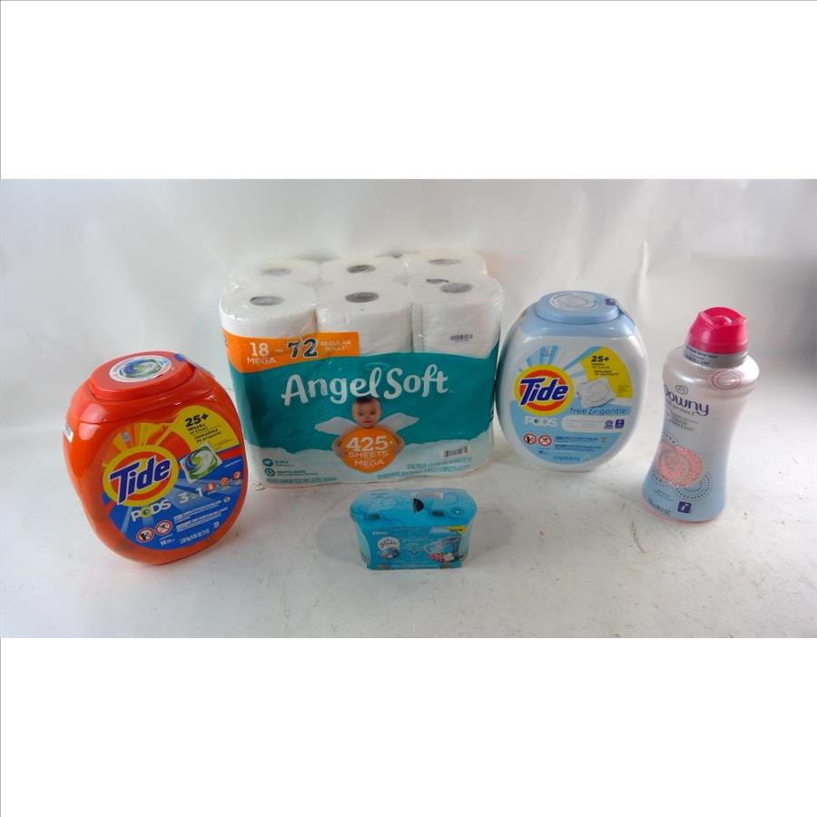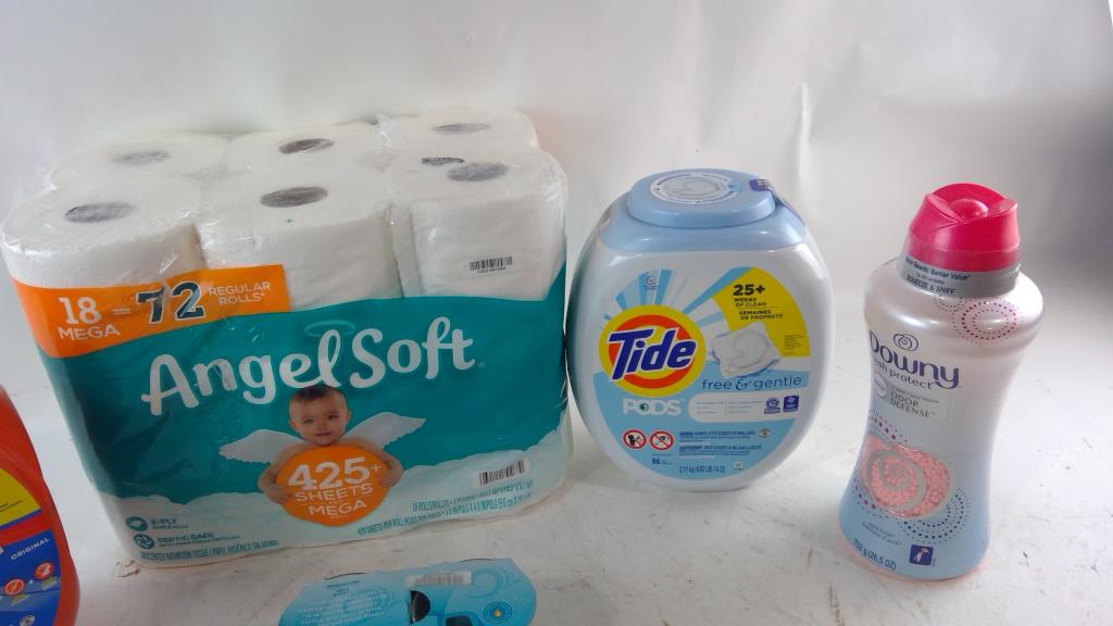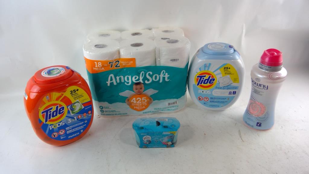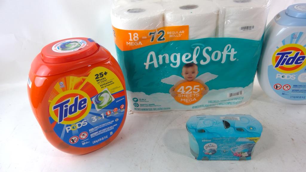 Get a great deal with this online auction presented by PropertyRoom.com on behalf of a law enforcement or public agency client. - Angel soft paper towels , Tide pods, Glade Candles, Downy Scent beads