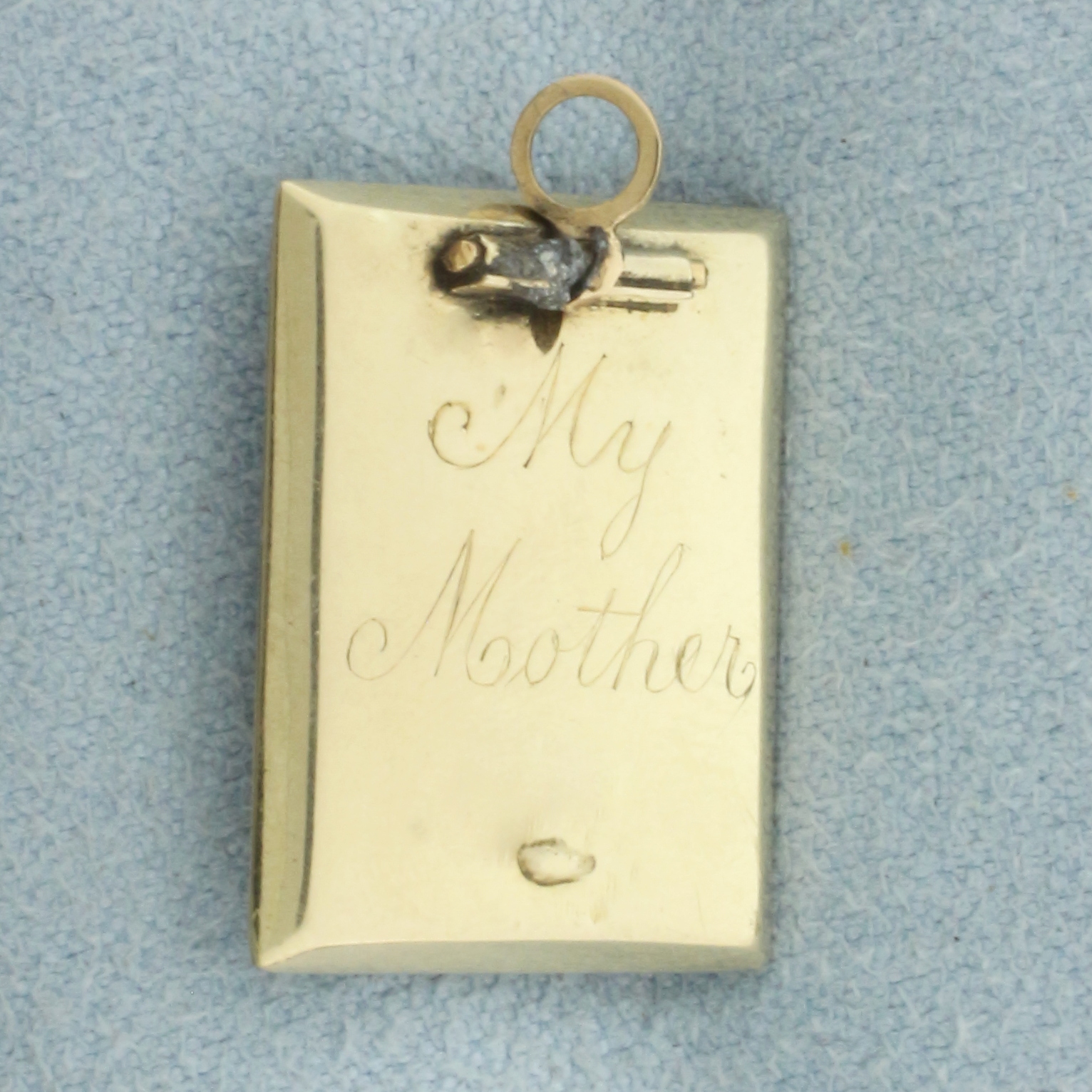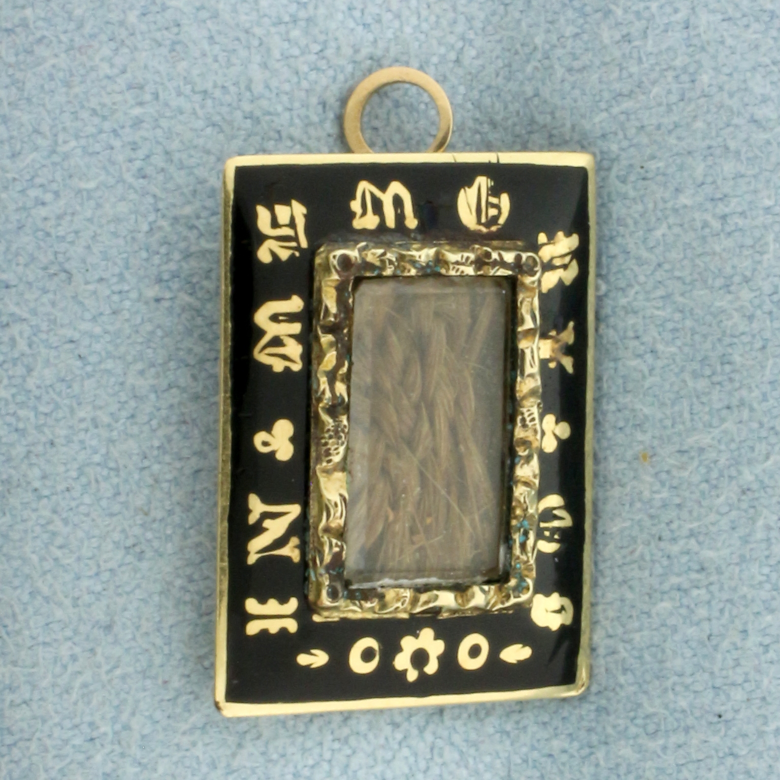In 18k Yellow Gold. 7/8 inch long including bail. 5/8 inch wide. Black enamel and actual braided hair inside. Engraved "My Mother" on back side. 2.6g.