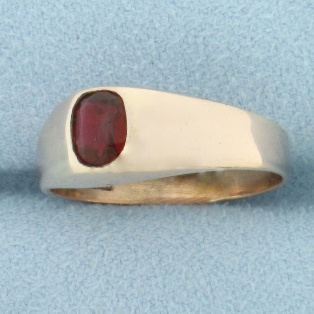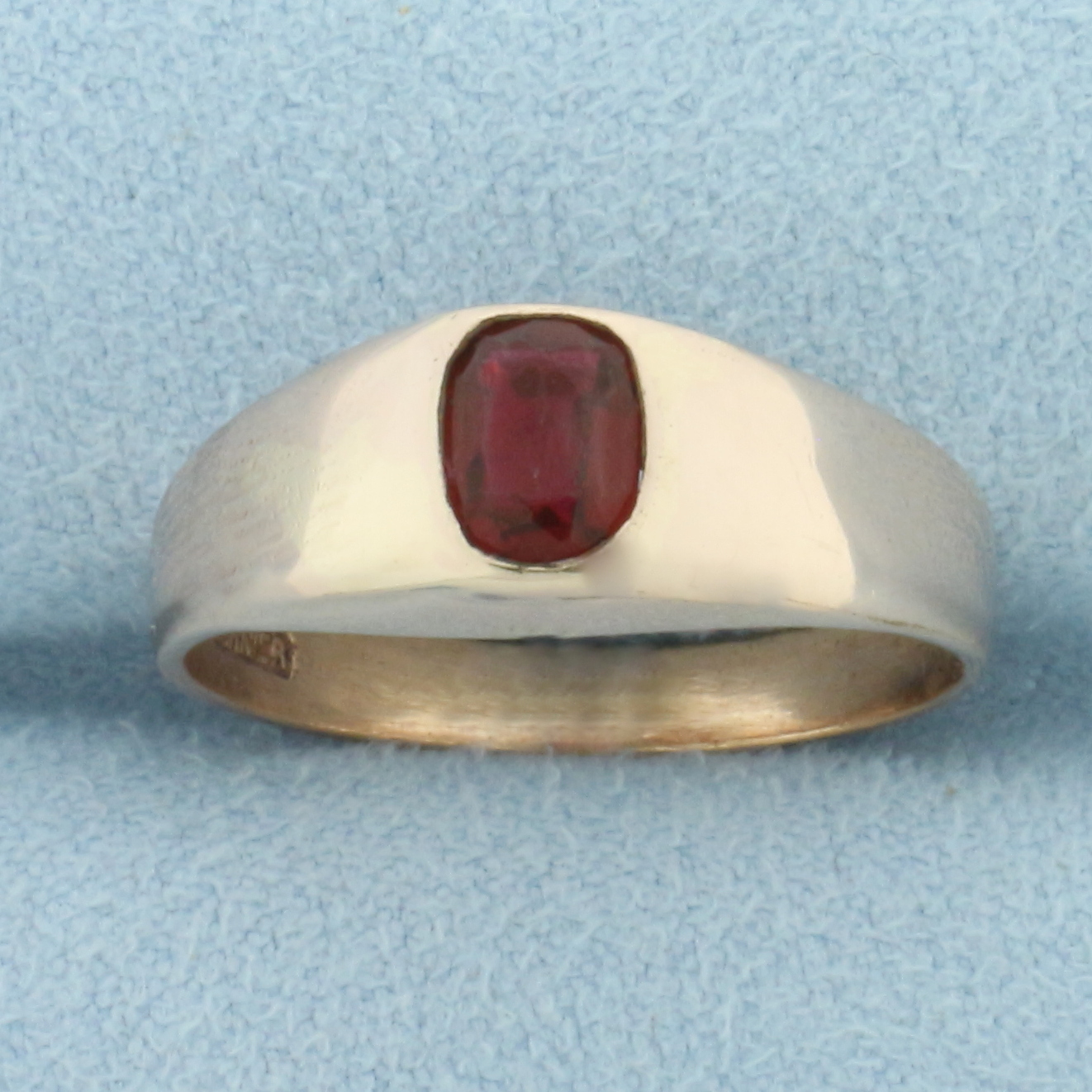 Rose gold plated. Contains one high quality 6.3mm by 5mm synthetic ruby with vibrant color and excellent clarity. Size: 8. 2.3g.