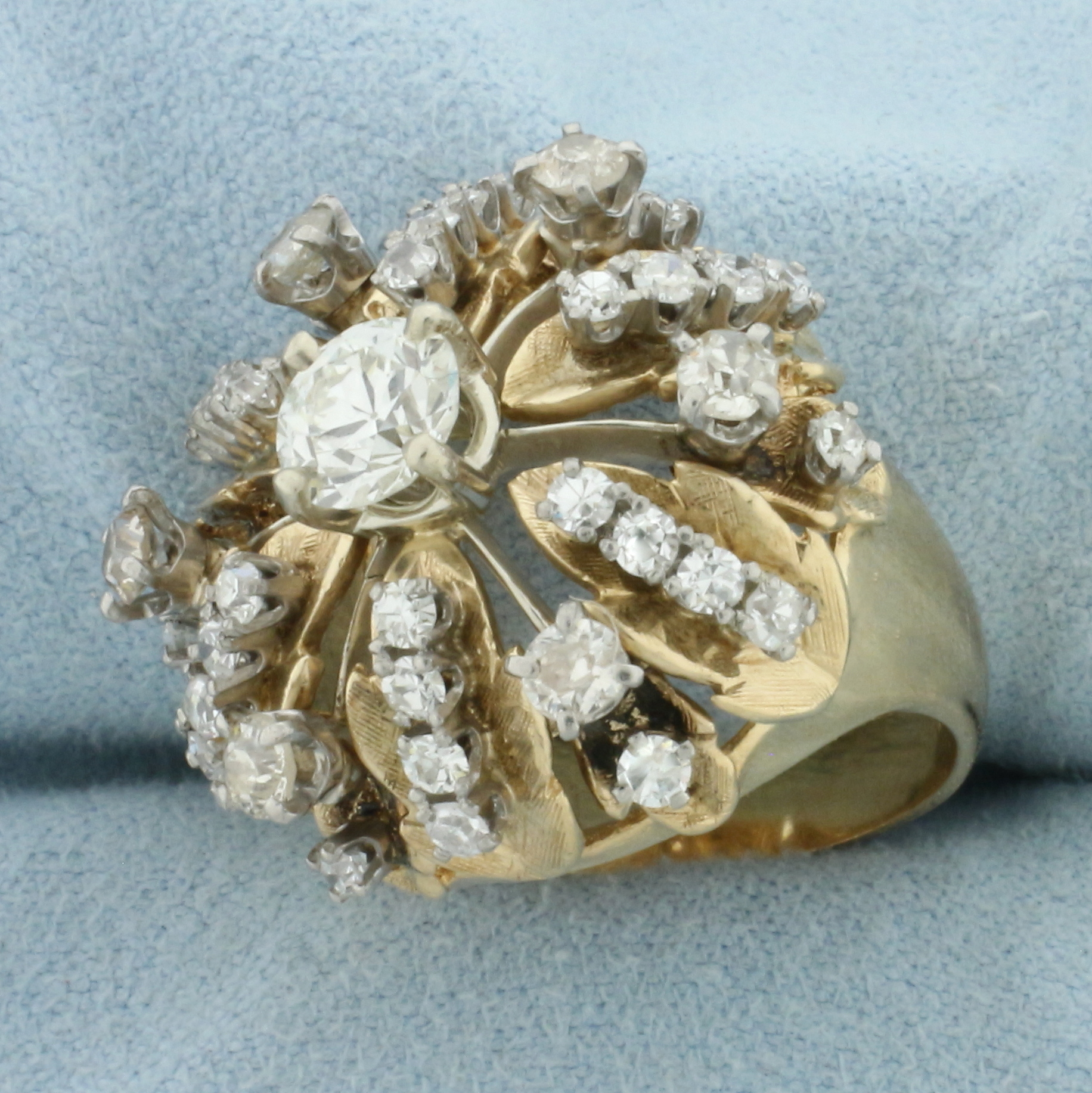 In 14k Yellow Gold. Contains one high quality .95ct Old European cut diamond, VS clarity/J color. Surround by six 1/8ct Old European Cut diamonds and thirty .03ct single out diamonds of similar high quality. 2.6ct TW. 23mm wide at widest point. Size 5.25. 13.7g.