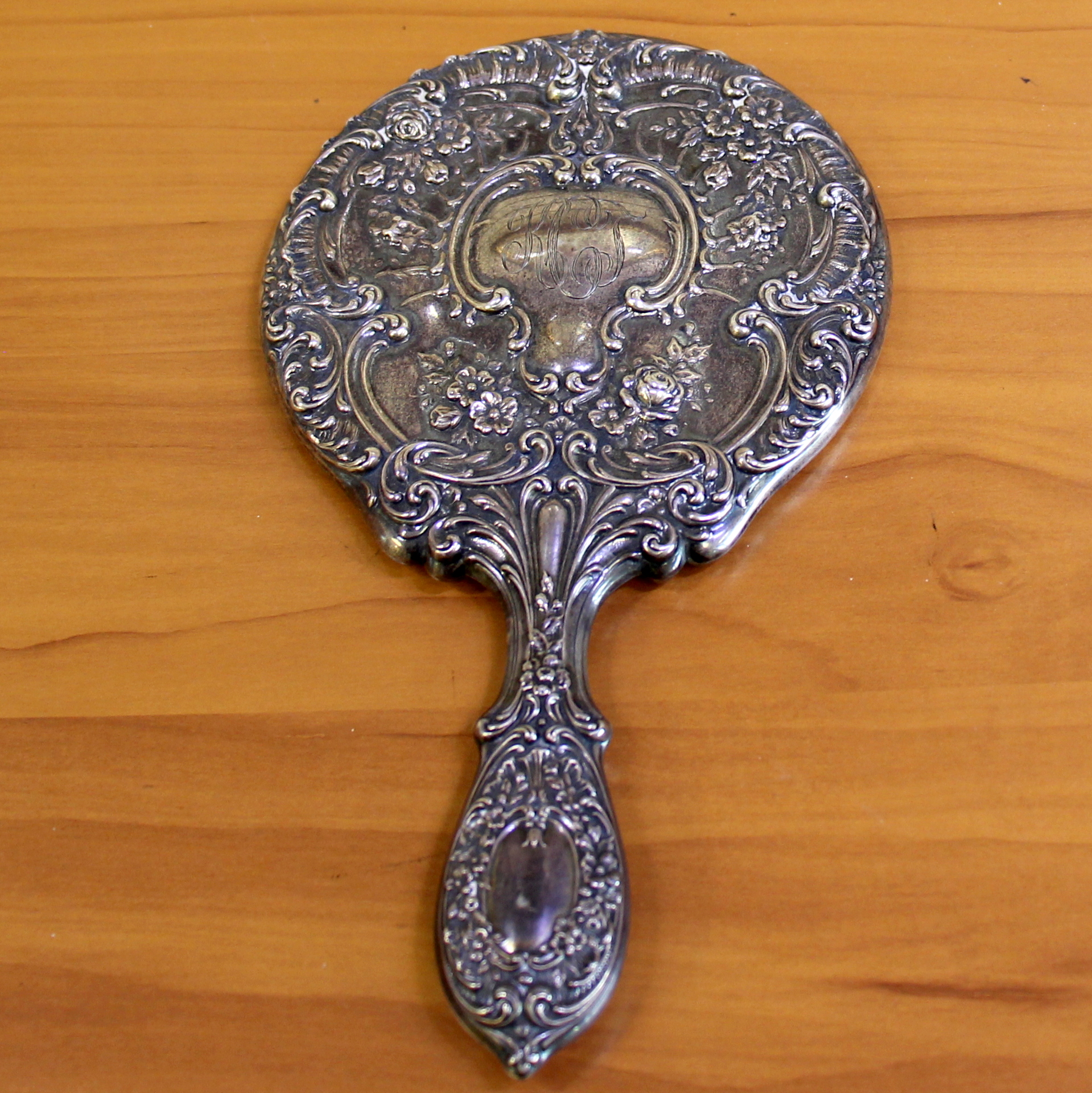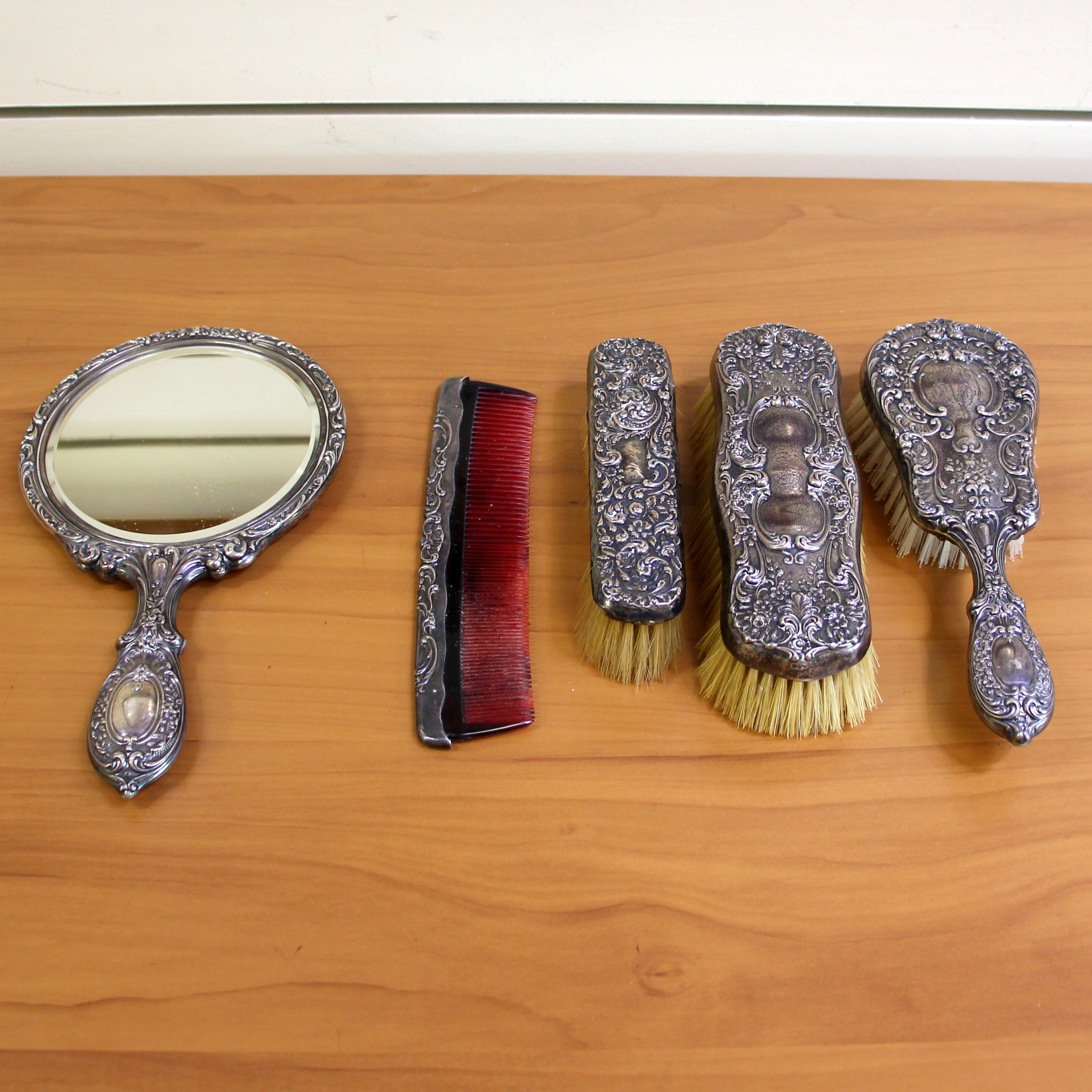 Set includes bristle hair brush (8 inches), comb-Gorham #23 (7.5 inches) , mirror (9.5 inches), clothes brush-large-Gorham c1456 (7 inches), Garment brush-medium (7 inches) Monograms as shown. Fantastic condition for age. 622.7g