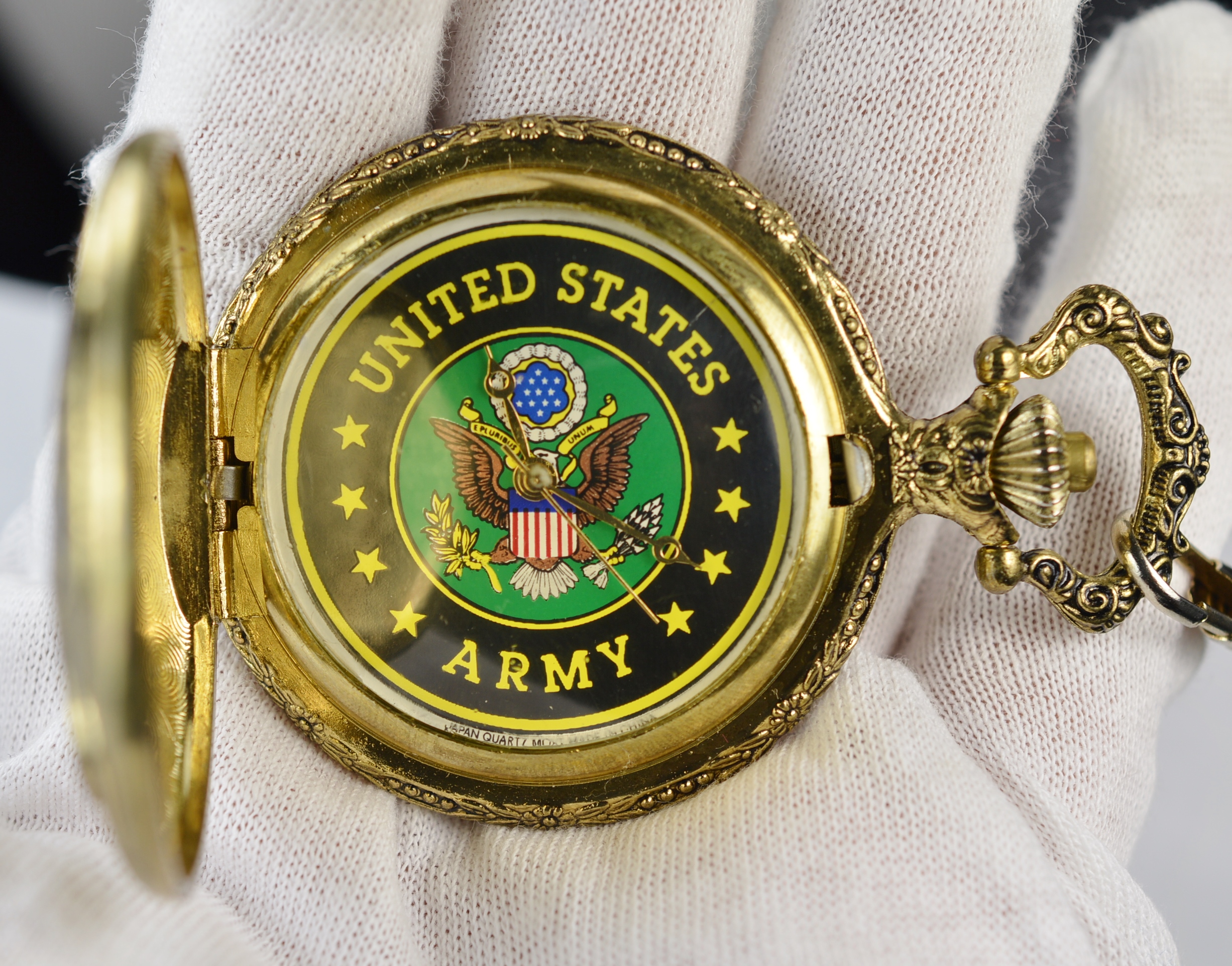 This antique pocket watch is a United States Army collection. This is a hefty pocket watch with much detail. Please see pics before bidding. This item is sold as is. Great for collectors or as a display piece.
