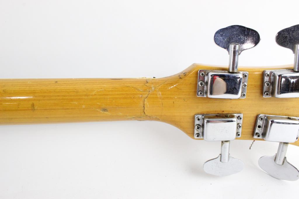 - Cosmetic Condition: Good, with scratches and scuffs. Volume knobs missing. Crack near headstock