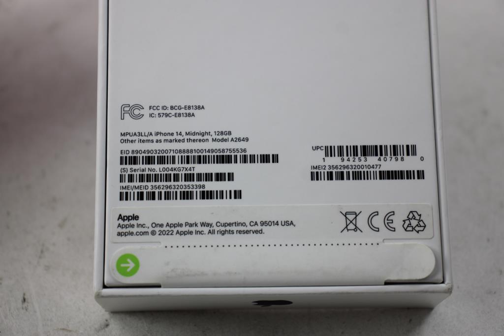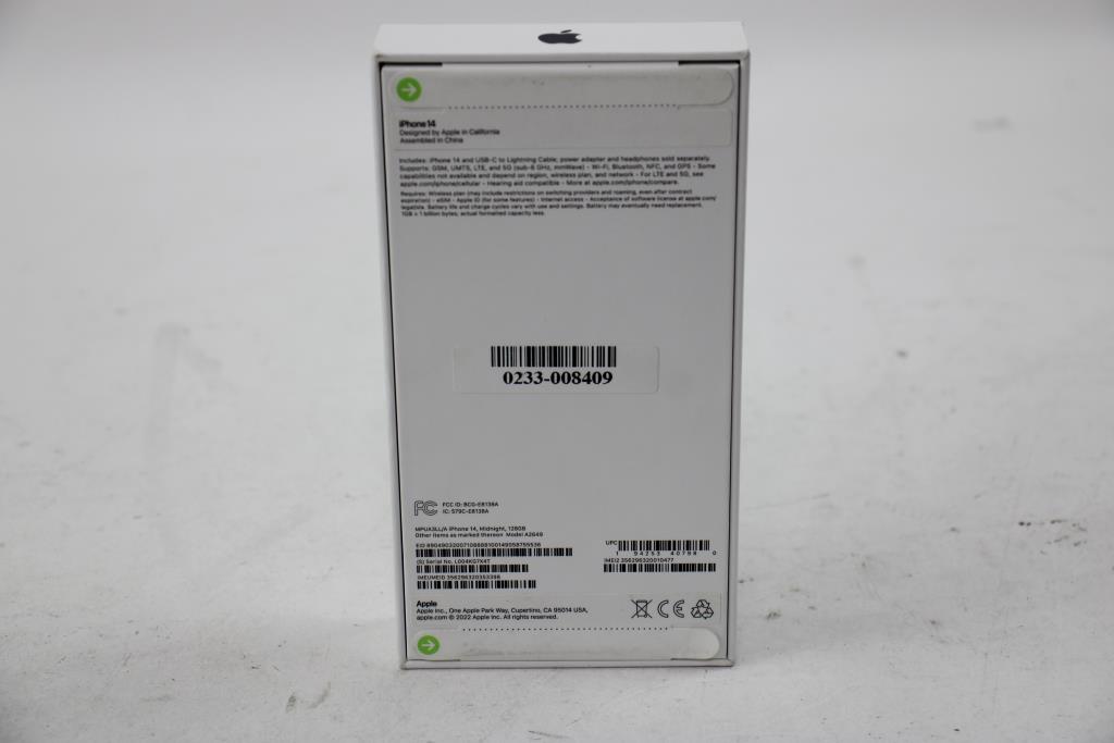 Get a great deal with this online auction presented by PropertyRoom.com on behalf of a law enforcement or public agency client. Model: A2649 IMEI/MEID/ESN/HEX: 356296320353398 Unable to test SIM card functionality Activation Lock: Unknown Carrier Lock: Unknown Physical Condition: New in Sealed box Testing Results: Item has not been tested