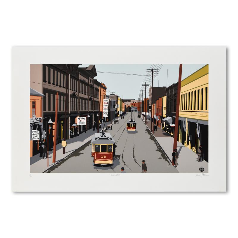 "Main Street 1907" is a limited edition hand pulled original serigraph on paper by Armond Fields (1930-2008), numbered and hand signed by the artist. Includes Letter of Authenticity. Measures approx. 34" x 23" (border), 28" x 16" (image).