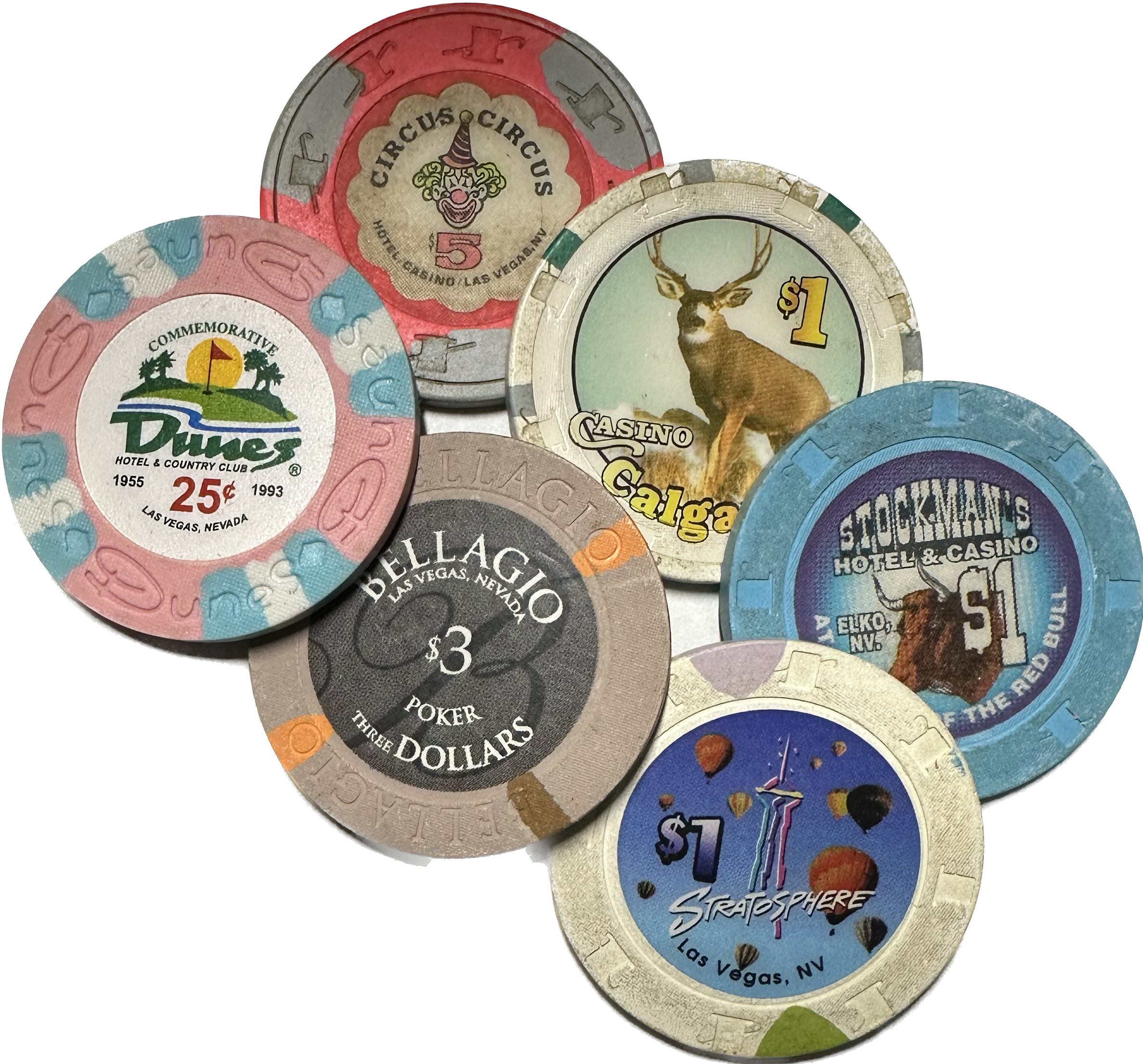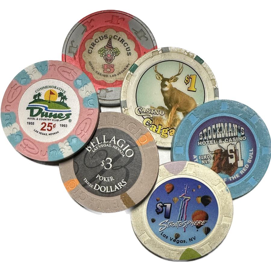 >Assortment of 6 Casino Gaming Chips - Dune's, Bellagio, Stockman's and More!