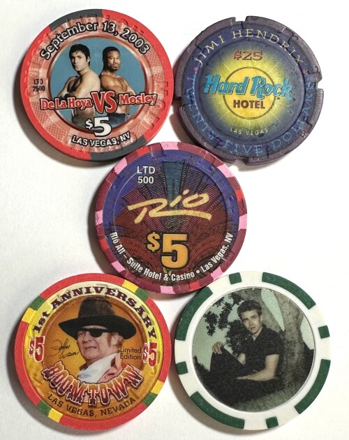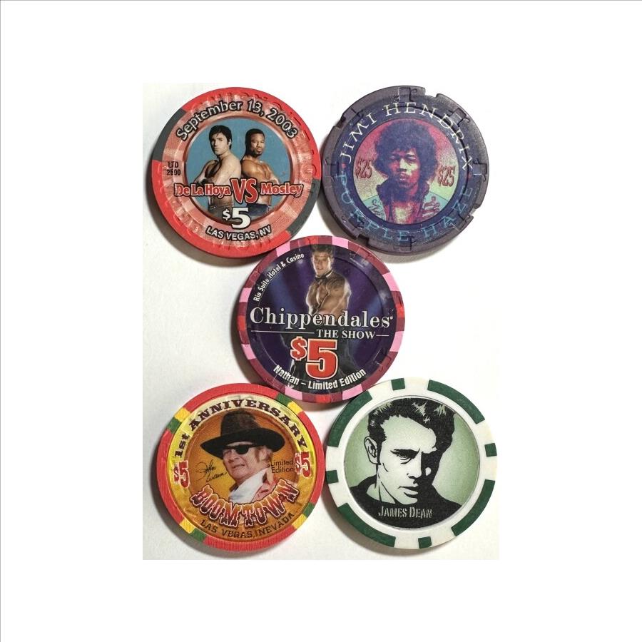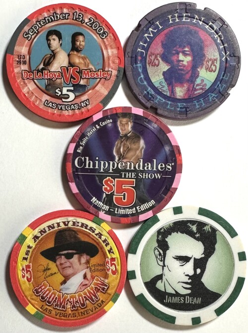 Assortment of Five Casino Tokens - Featuring John Wayne, Jimi Hendrix, Dela Hoya vs. Mosely, James Dean & the Chippendales