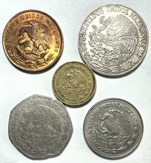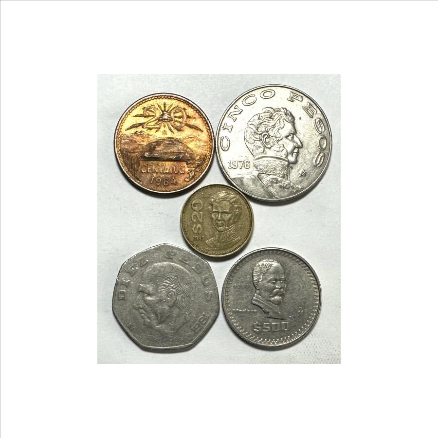 Assortment of Mexico Coins - 1964 20 Centavos, 1976 5 Pesos, 1981 10 Pesos, 1985 2 Pesos, & 1987 500 Pesos - 5 Coins