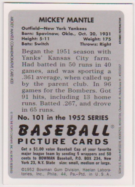 This is a 1996 Topps Mickey Mantle 1952 Bowman #20 commemorative Atomic Refractor insert card.  This was a tough refractor insert to pull from packs.  This is an approximately EX-MT to Near Mint card of this Yankees legend.