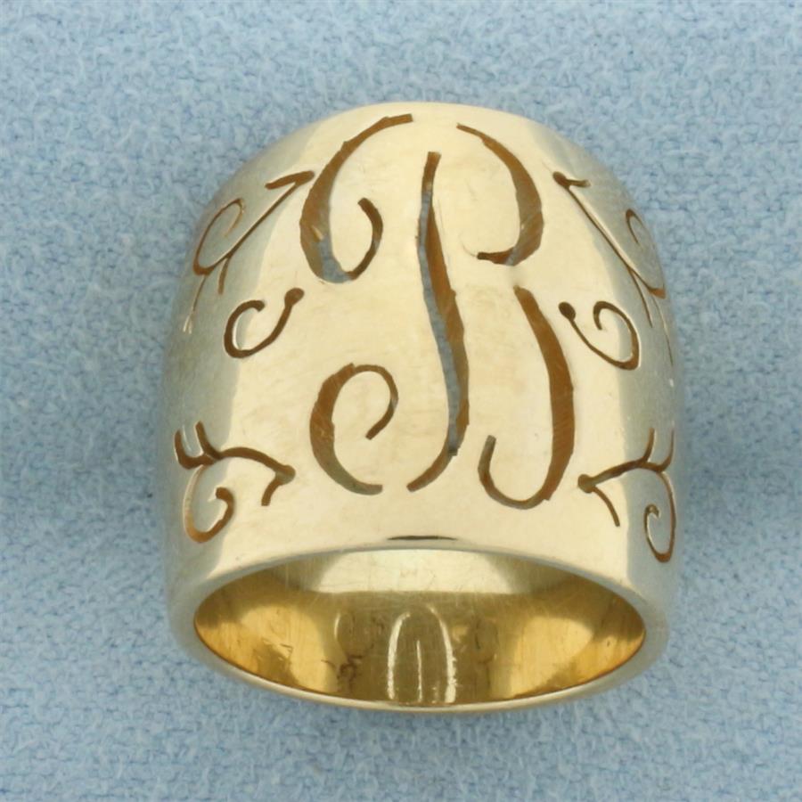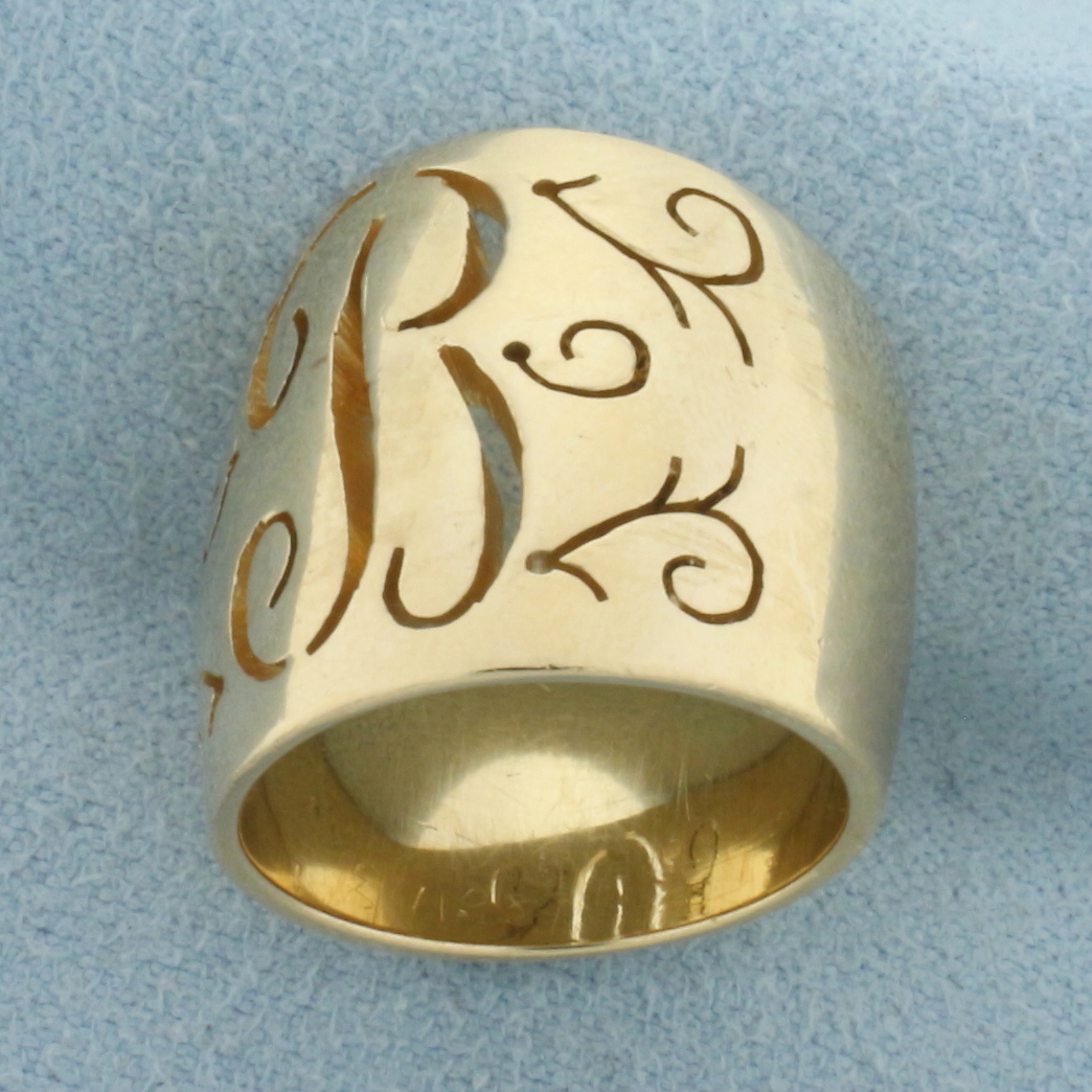 B Initial Monogram Cut Out Wide Cigar Band Ring in 14k Yellow Gold