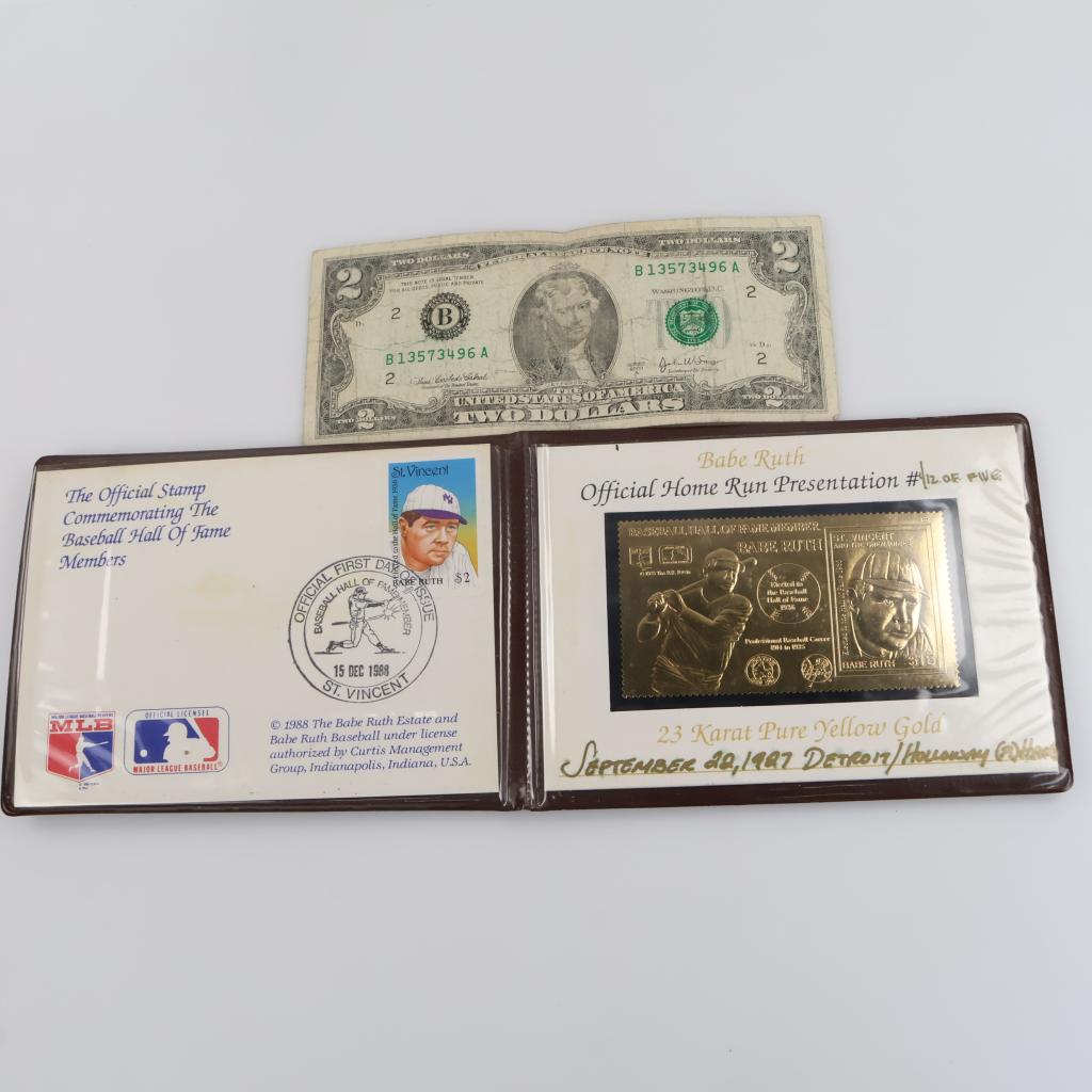 Babe Ruth 1st Day Cover With Foil Stamp And US Federal Reserve Note, 2 Pieces