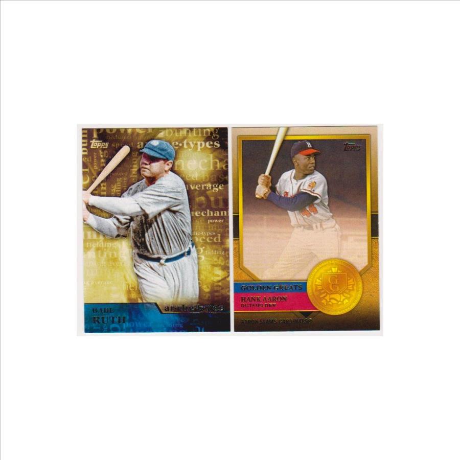 This is a Babe Ruth and Hank Aaron baseball card pair.  You get one each of a Babe Ruth 2015 Topps Archetypes #A-10 Insert card and Hank Aaron 2012 Topps Golden Greats #GG-51 Insert card.  These are in approximately Near Mint condition.  This is a nice looking pair of cards of these two baseball legends.