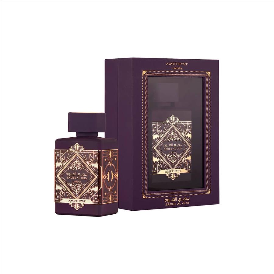 Top notes: Pink pepper, Bergamot. Heart notes: Turkish rose, Bulgarian rose, Jasmine. Base notes: Agarwood (oud), Amber, Vanilla. Design house: Lattafa. Scent name: Bade'e Al Oud Amethyst.