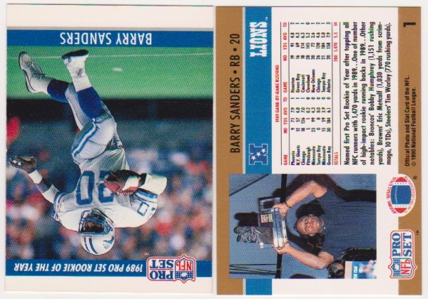 This is a pair of 1990 Pro Set Barry Sanders #1 cards.  You get a double front print error that has a white bordered Sanders front printed on each side.  You also get a blank front version of the card.  They have minor wear but overall this is a nice pair of Sanders error cards from early in his NFL career.