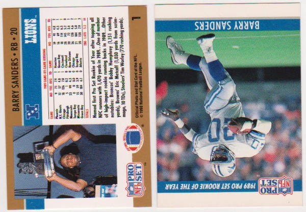 This is a pair of 1990 Pro Set Barry Sanders #1 cards.  You get a double front print error that has a white bordered Sanders front printed on each side.  You also get a blank front version of the card.  They have minor wear but overall this is a nice pair of Sanders error cards from early in his NFL career.