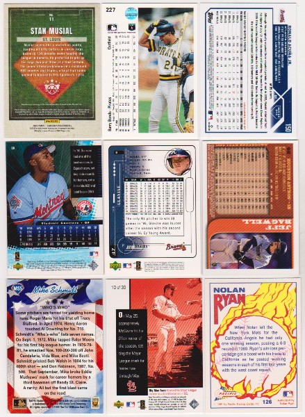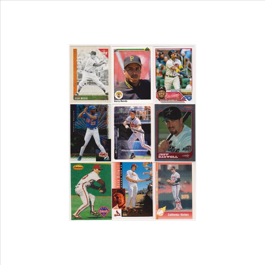 This is a collection of 9 different baseball cards of all star and Hall of Fame players.  These range from 1990-2023.  This lot includes Stan Musial, Barry Bonds, Ronald Acuna Jr., Tom Glavine, Vladimir Guerrero, Nolan Ryan, Mark McGwire, Mike Schmidt, and Jeff Bagwell.   These are mostly in the EX-MT to NM-MT condition range.  This is a nice lot featuring a nice mix of stars.