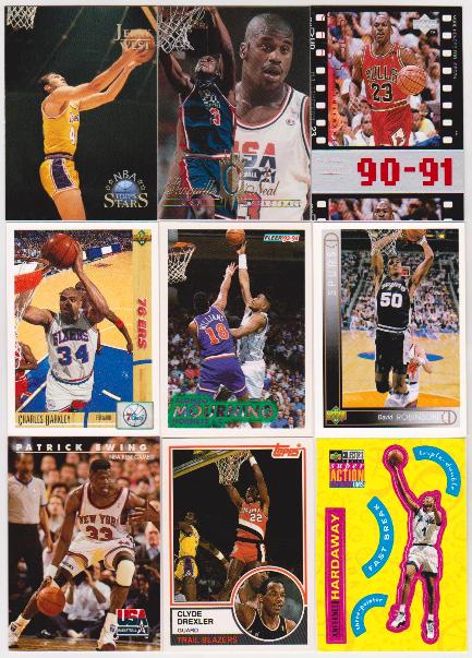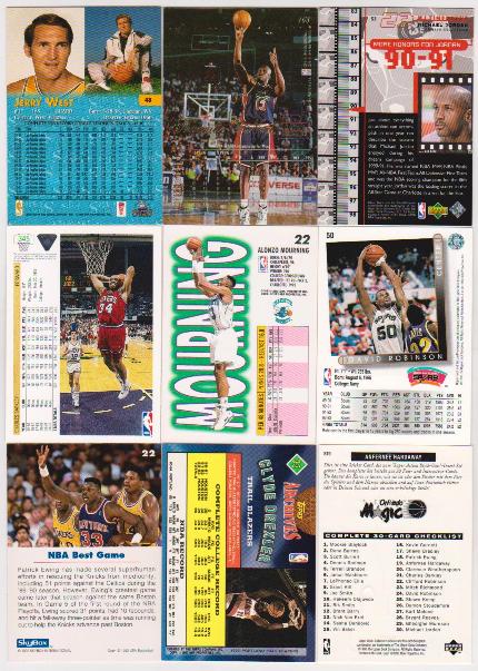 This is a collection of 9 different basketball cards of star and Hall of Fame players.  This lot includes Michael Jordan, Shaquille O'Neal, Jerry West, David Robinson, Alonzo Mourning, Charles Barkley, Anfernee Hardaway, Clyde Drexler, and Patrick Ewing.  These are mostly in the EX-MT to Near Mint condition range.  This is a nice lot featuring a nice mix of stars.