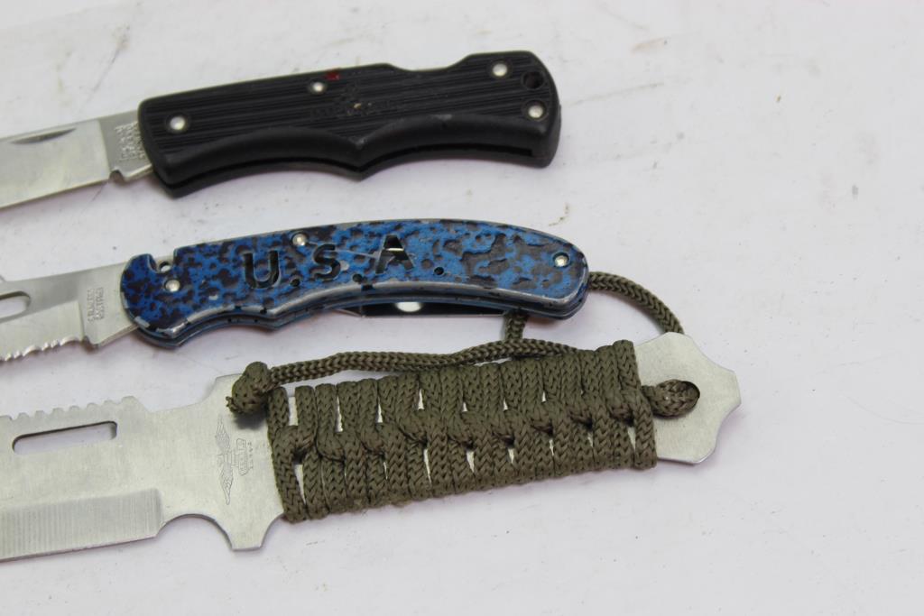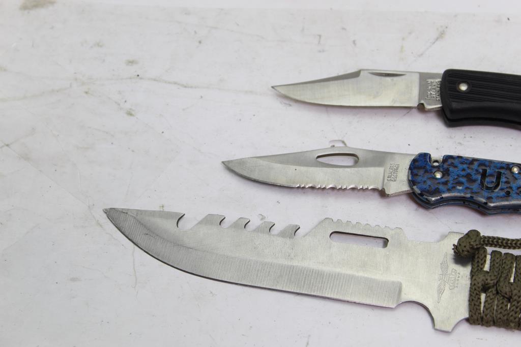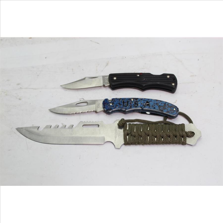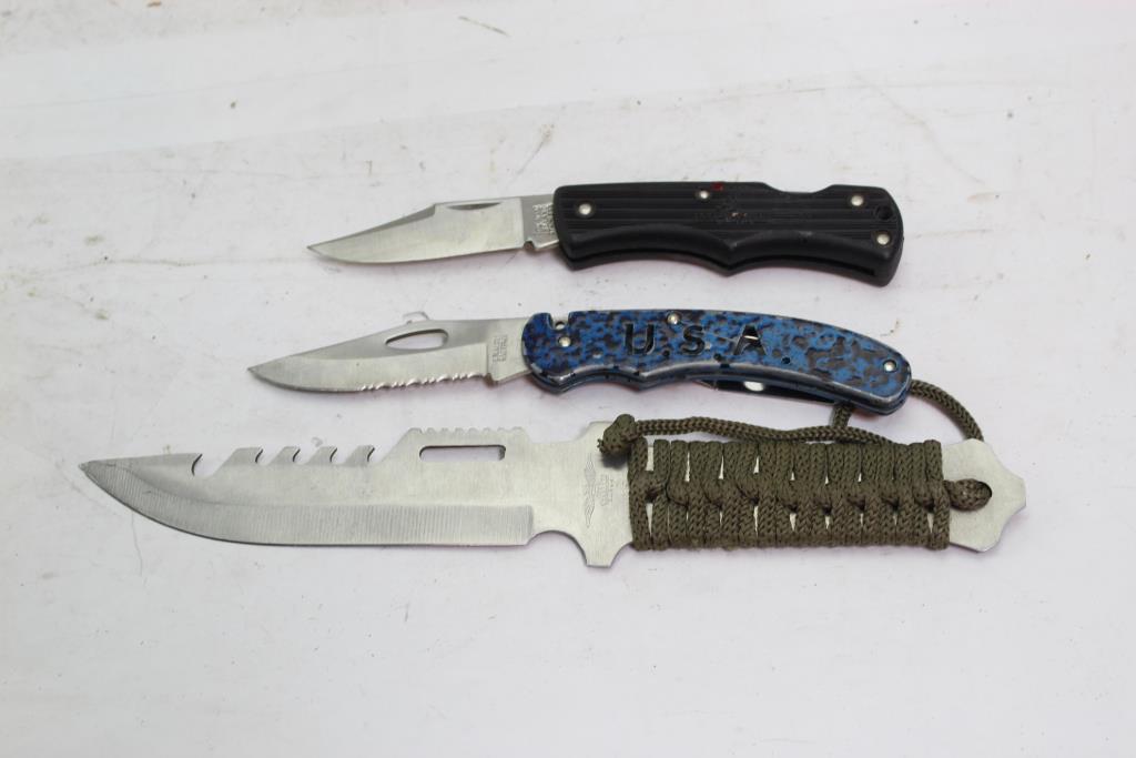 - Includes 2 folding knives and 1 fixed blade knife