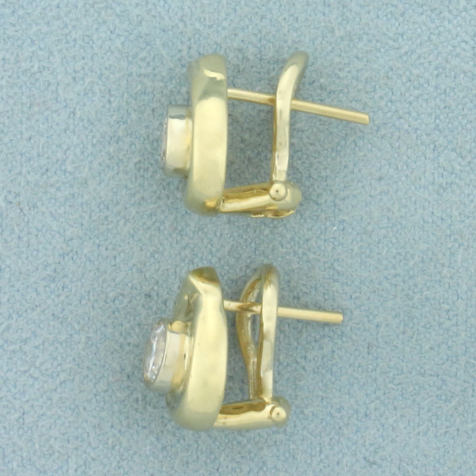 In 18k yellow gold. Contains two high quality CZ gemstones, 3/4ct TW, with excellent cut and clarity for added brilliance. 3/8 inches long and 3/8 inches wide. Omega backs. 4.6g.