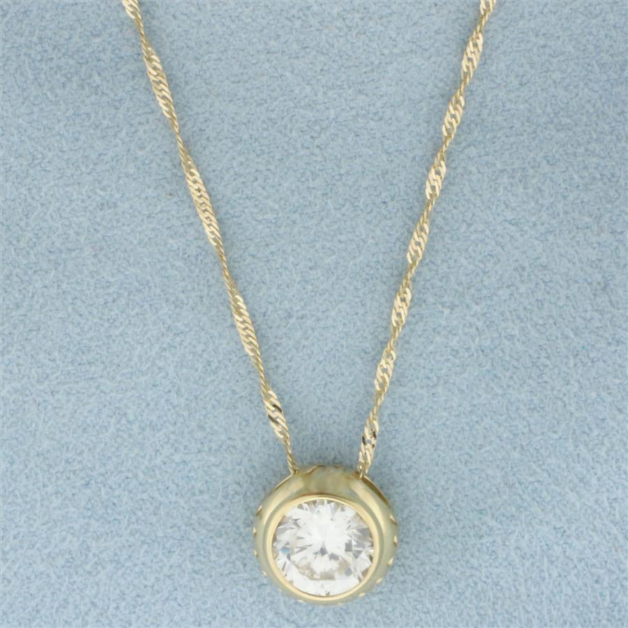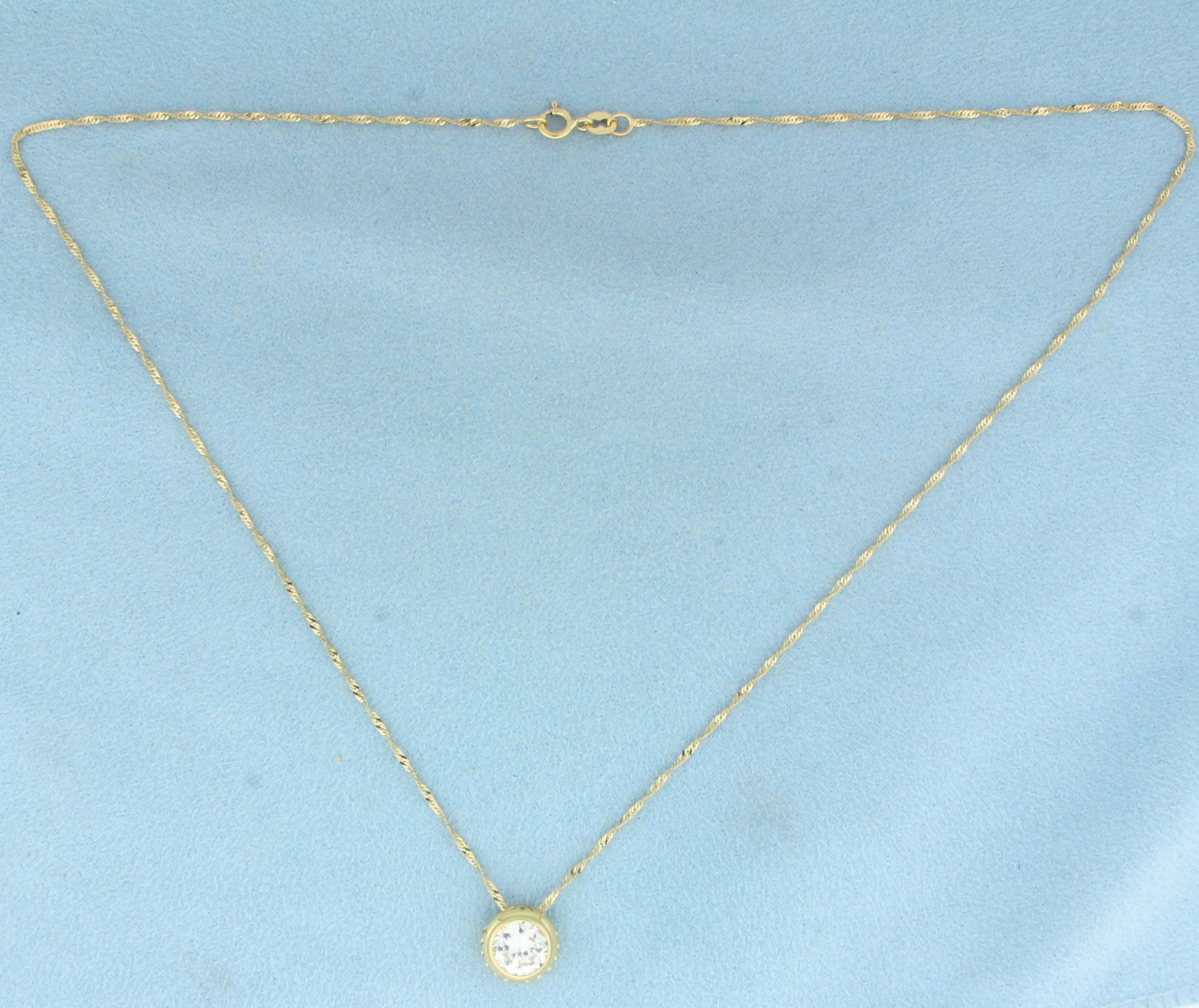 In 14k Yellow Gold. Contains one 8mm high quality Cubic Zirconia, approximately 2.5ct, with excellent cut and color for added brilliance. Twisting curb link chain is 18 inches long chain. 1mm wide. Spring clasp. 3.0g.