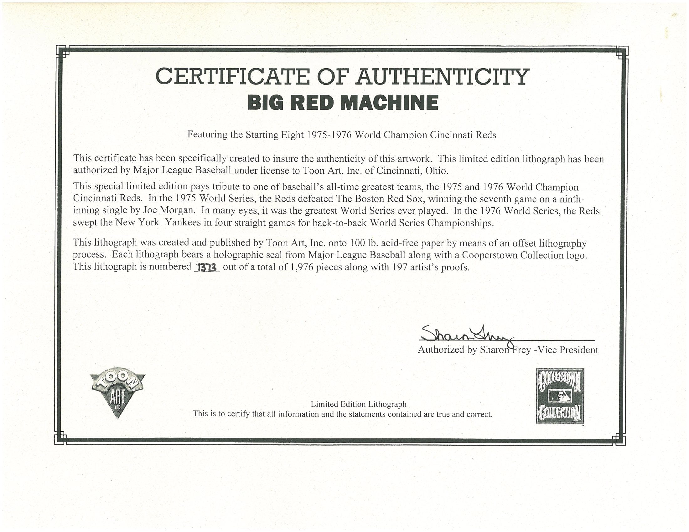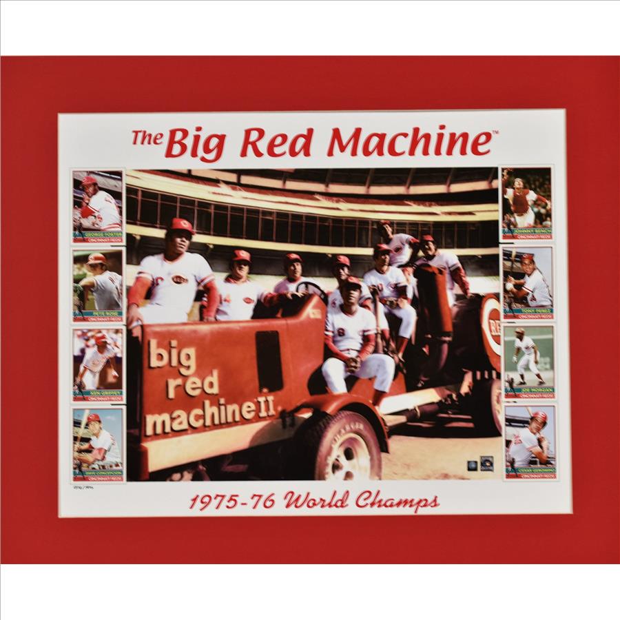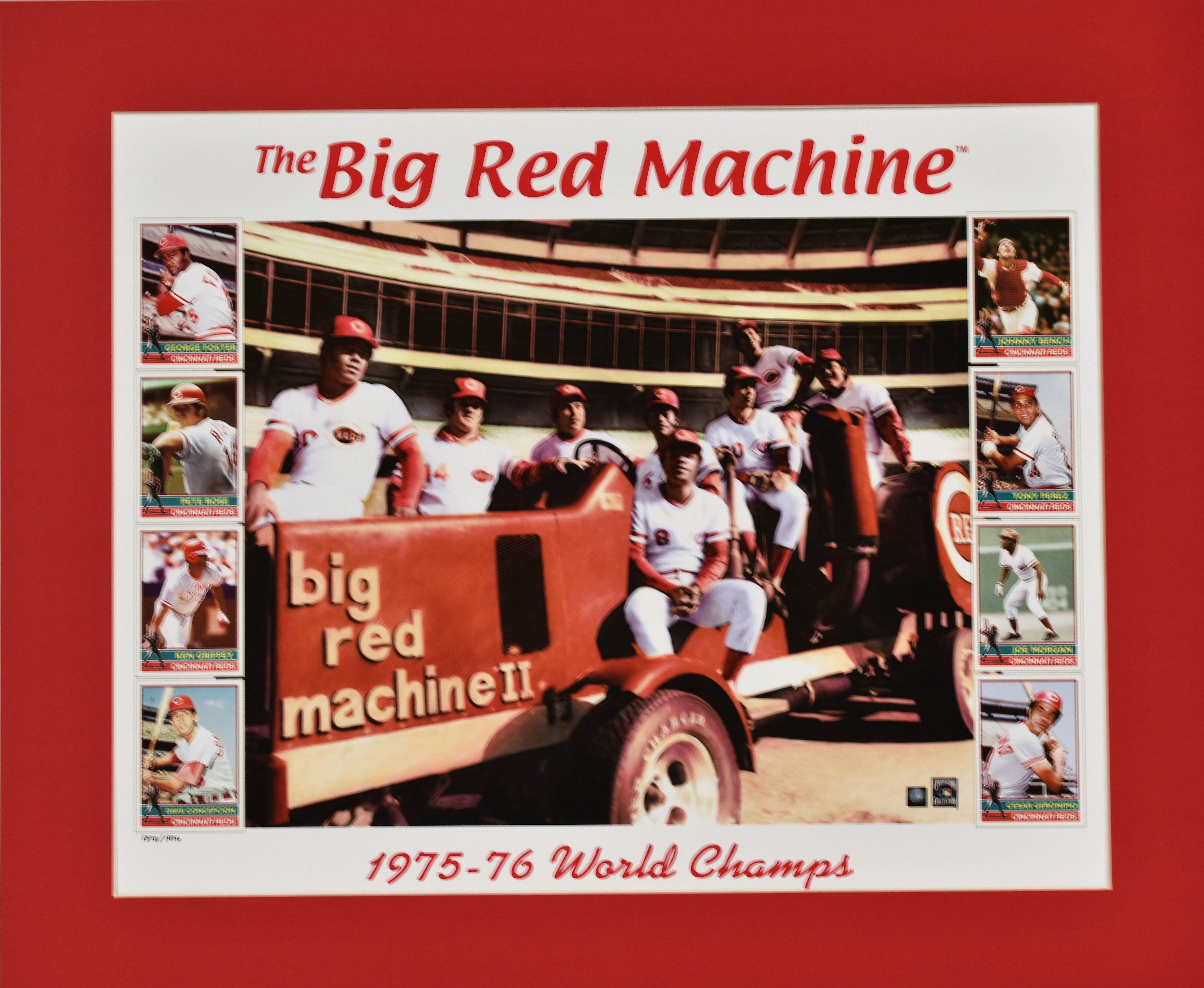 A limited edition offset lithograph titled " The Big Red Machine" featuring the "Great 8” of the Cincinnati Reds. These baseball players are depicted seated and standing on a mechanical machine. This work is adorned with printed images of the players’ baseball cards. George Foster, Pete Rose, Ken Griffey, Dave Concepcion, Johnny Bench, Tony Perez, Joe Morgan and Cesar Geronimo. Is presented matted 20x24 with COA.