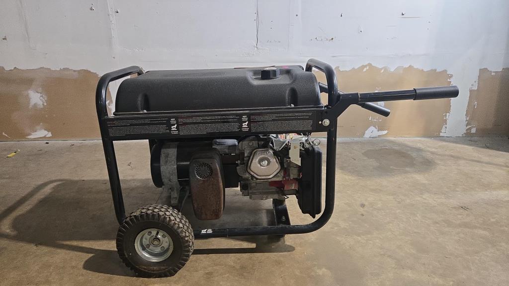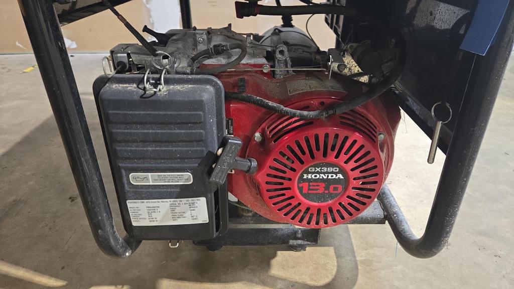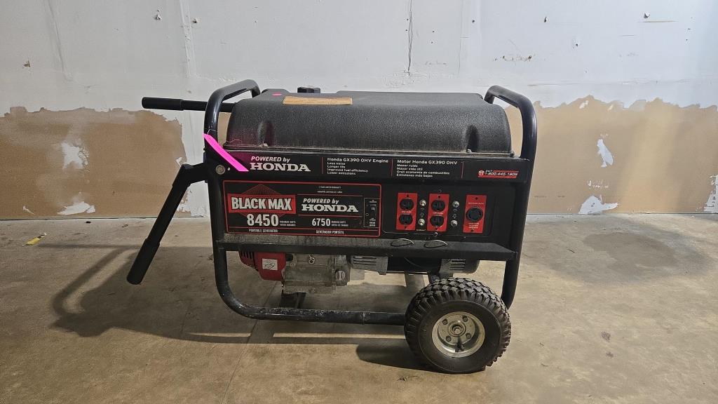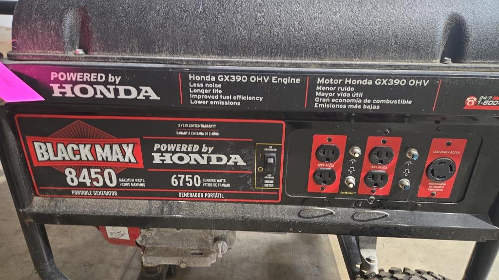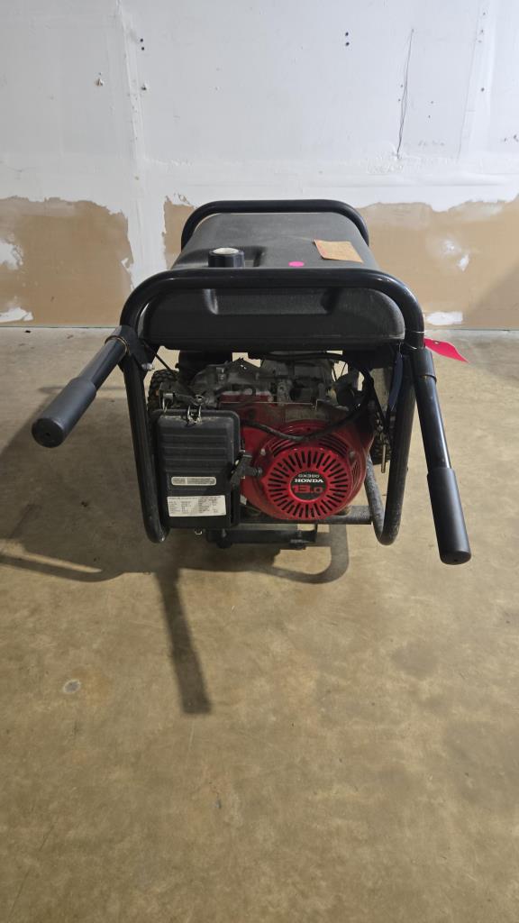 - Item info: Honda Engine, 5 Plugs, 6750 Running Watts, 8450 Max Watts, gas powered and pull cord start.