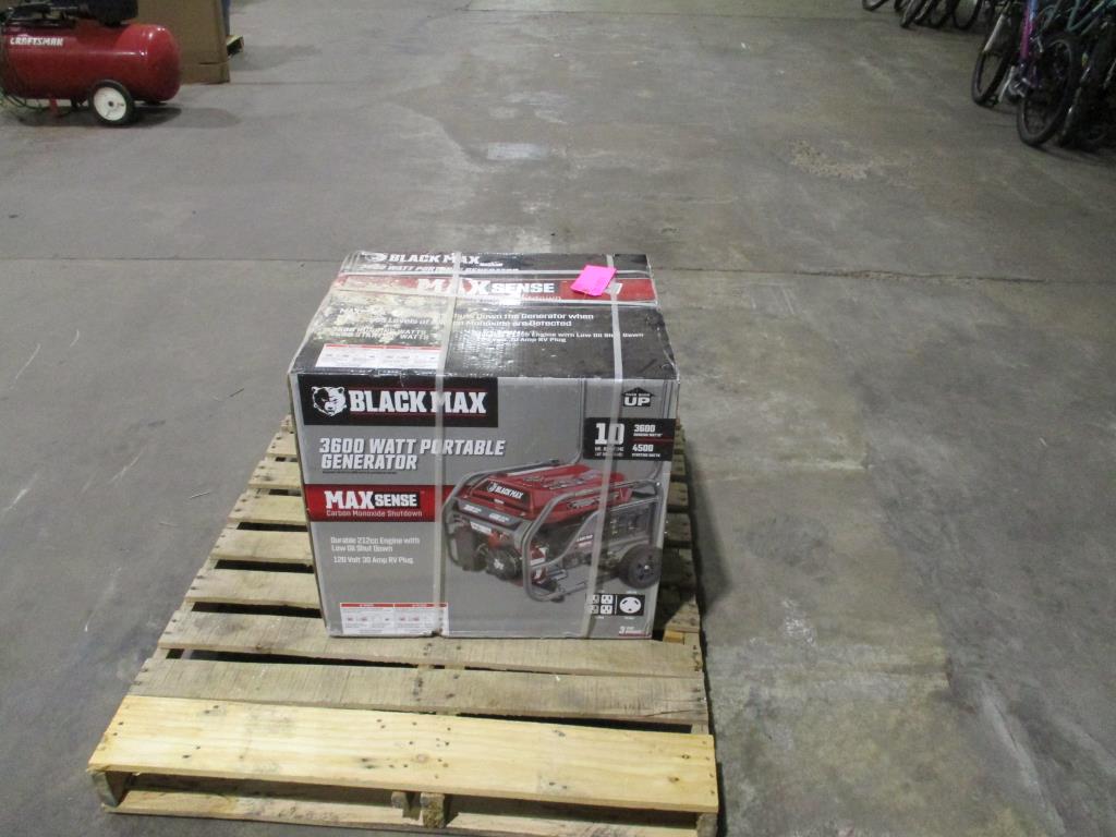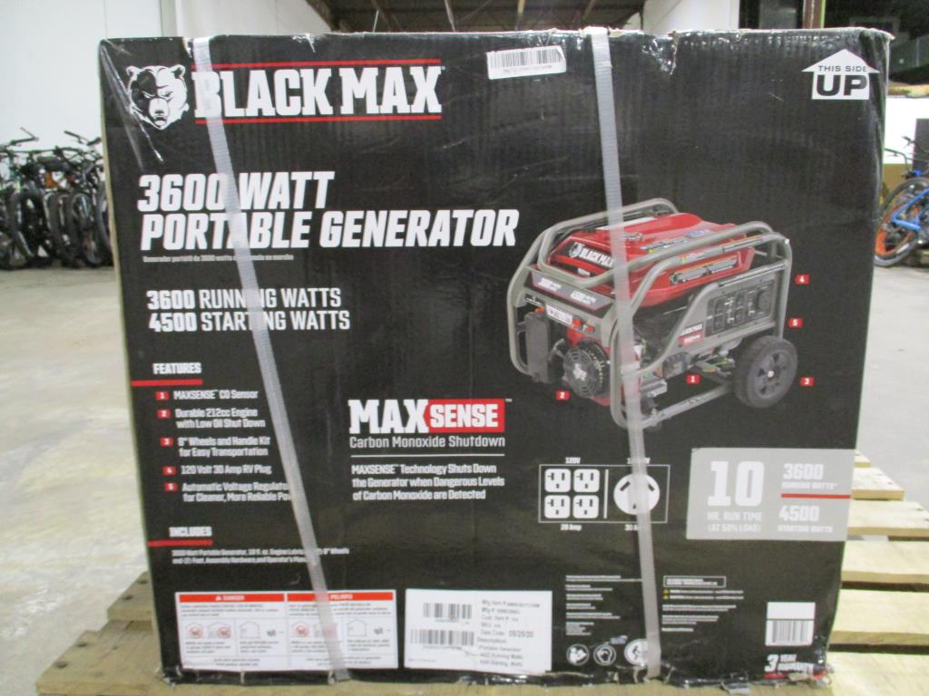 - Item info: gas powered, pull cord start, 3600 running watts, 4500 starting watts,4 120v 20amps, 1 120v RV 30amp, 3 circuit brakes, black max engine.