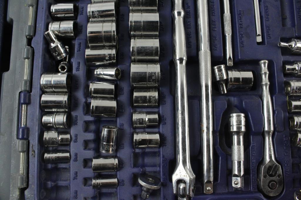 - Includes socket wrenches, drivers and assorted sockets.