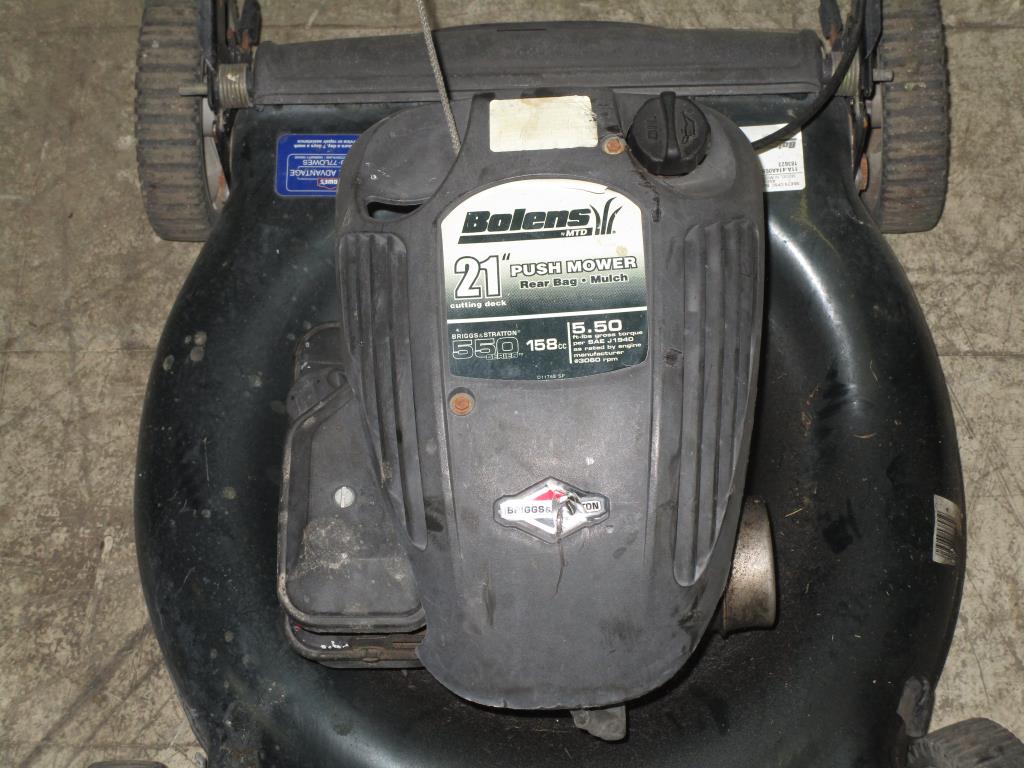Get a great deal with this online auction presented by PropertyRoom.com on behalf of a law enforcement or public agency client. Brand: Bolens Model: 11A-414A065 Color: Green and Black Gas powered, pull cord start, self propelled, 21" cut, adjustable cut height, rear discharge no bag, primer button. Engine: Briggs & Stratton 550 series, 5.5hp, 158cc - Measurements:39" T X 23" W X 66"L.