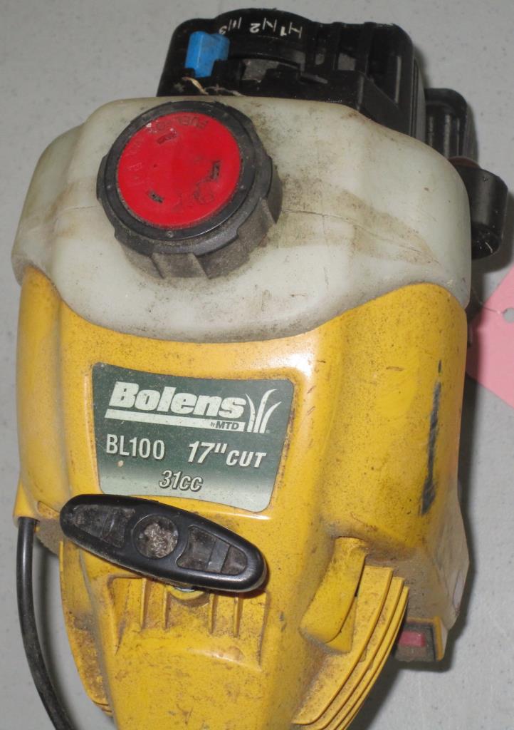 Get a great deal with this online auction presented by PropertyRoom.com on behalf of a law enforcement or public agency client. Brand : Bolens Model: BL100 Color :Yellow and Black Gas powered, pull cord start, 17" cut, 31cc, trigger throttle, kill switch, curved bar, line guard, handle for stability. - Measurements: 57"