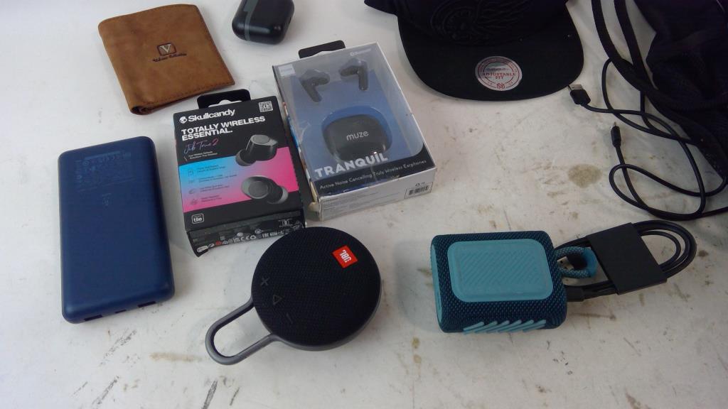 Get a great deal with this online auction presented by PropertyRoom.com on behalf of a law enforcement or public agency client. - Jbl speaker, Skullcandy earbuds, Belkin power bank, Adidas stringbag, Hat, and more