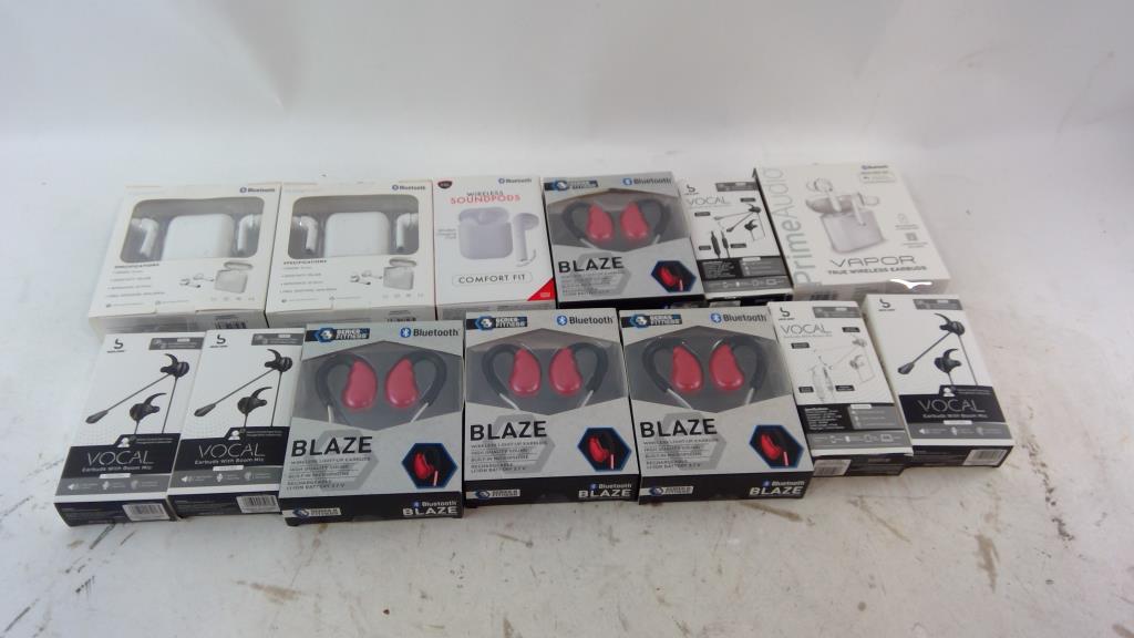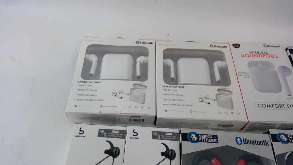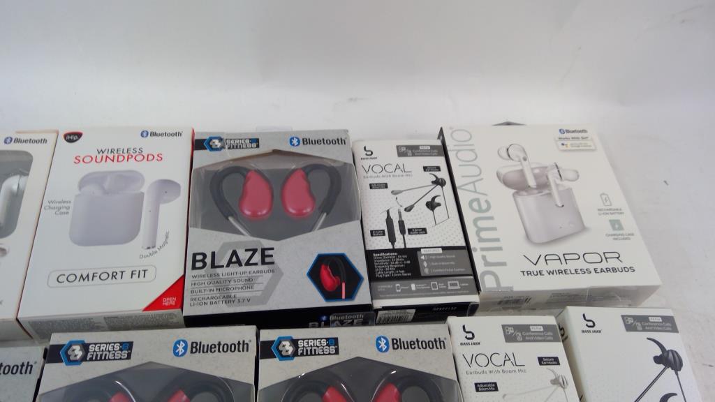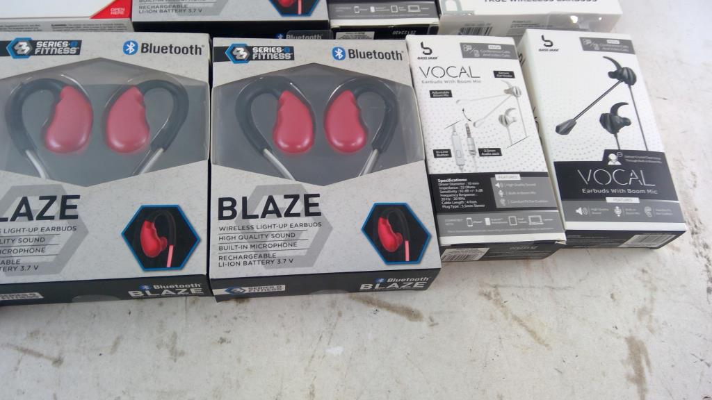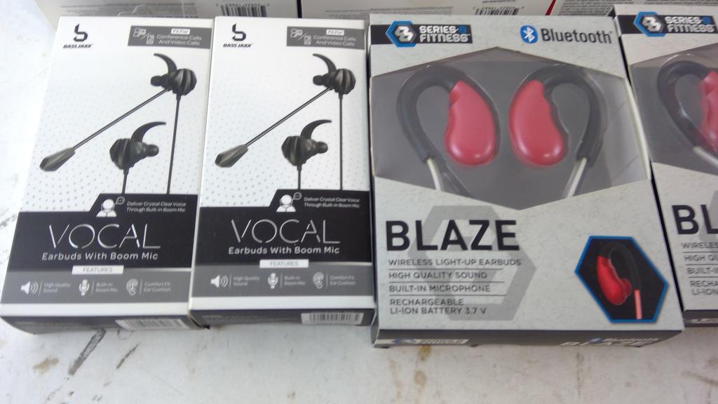 Series 8 Fitness, Blaze wireless light up earbuds, Ihip wireless soundpods, Bass Jaxx earbuds with boom mic and more