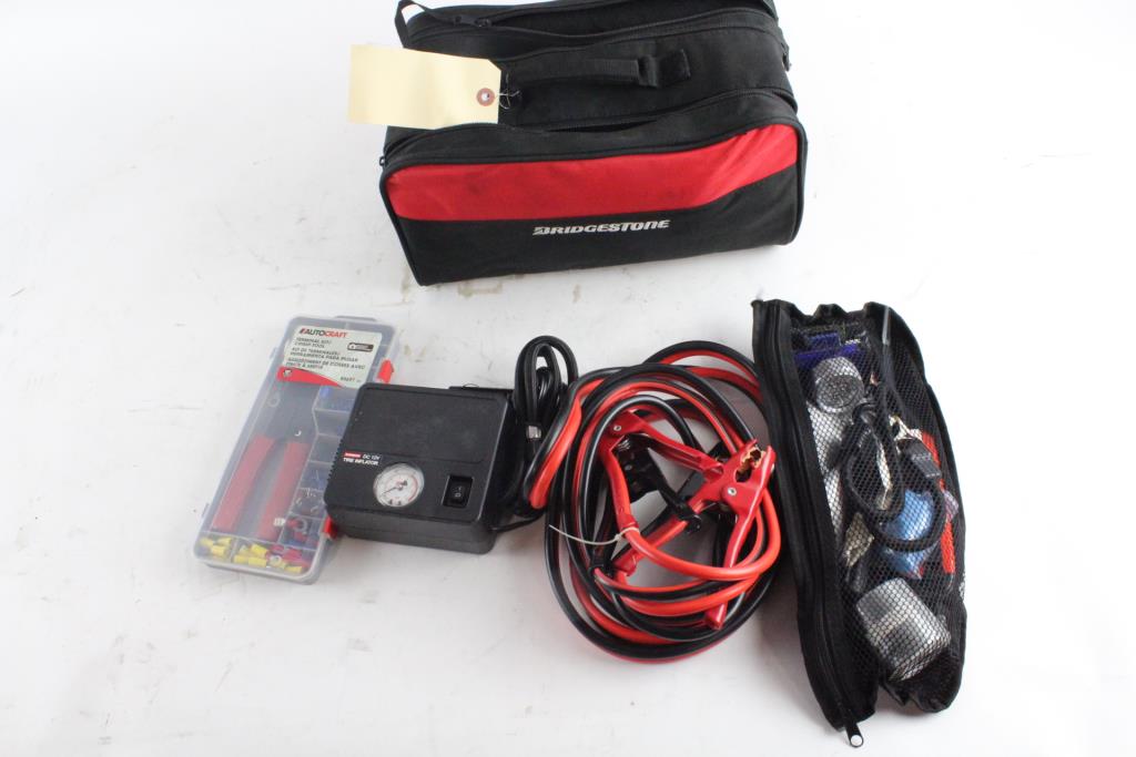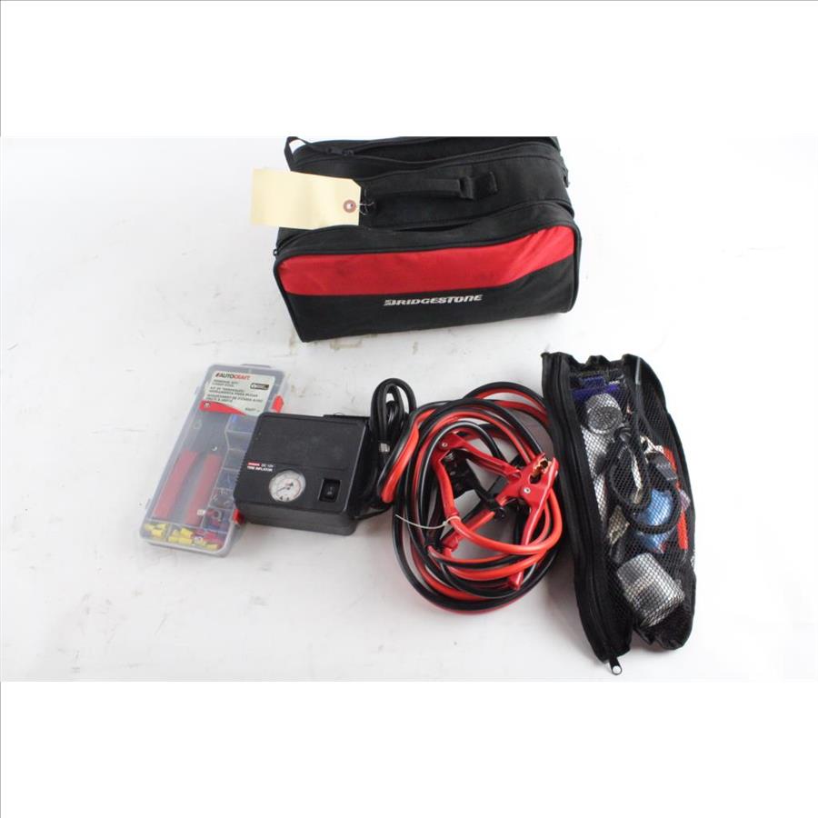 - Includes: Poncho, AAA Batteries, Blanket, Air Compressor, Booster Cables and more