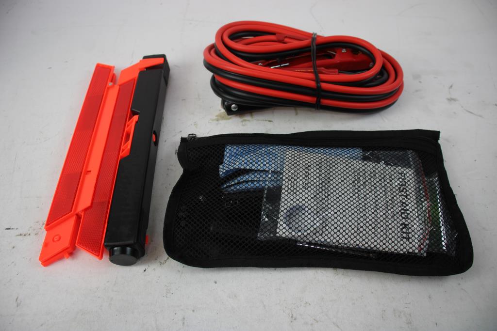 - Included: Survival blanket, Small flashlight, Jumper cables