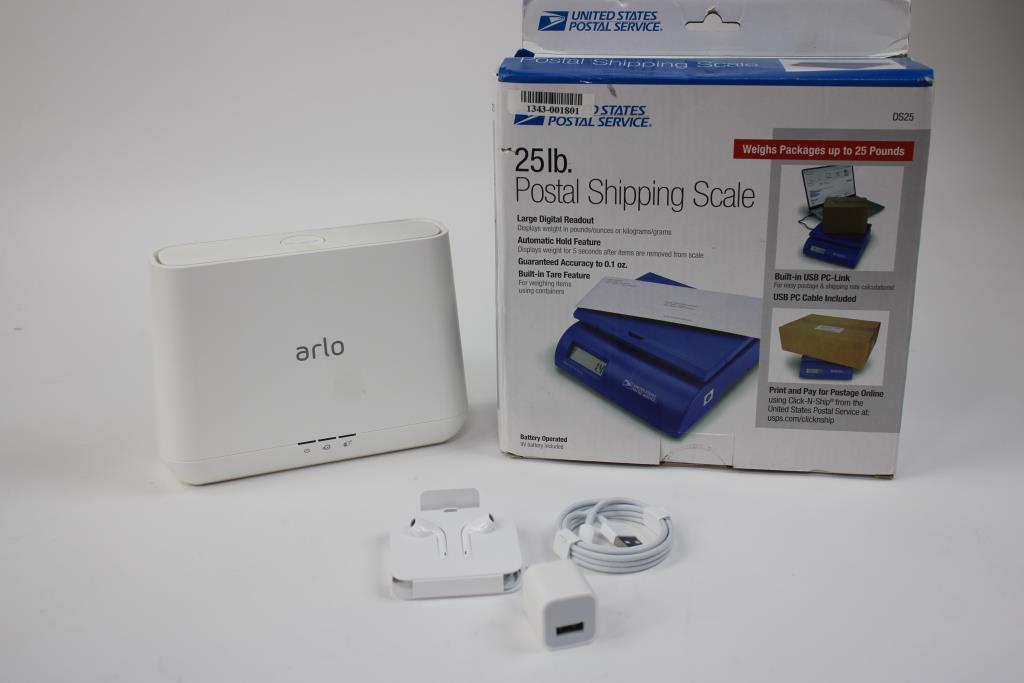Bulk Lot Shipping Scale, Windshiel Projector, Speaker, Apple Charger, Arlo Camera