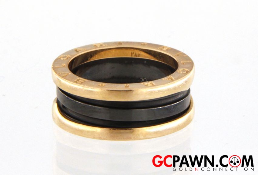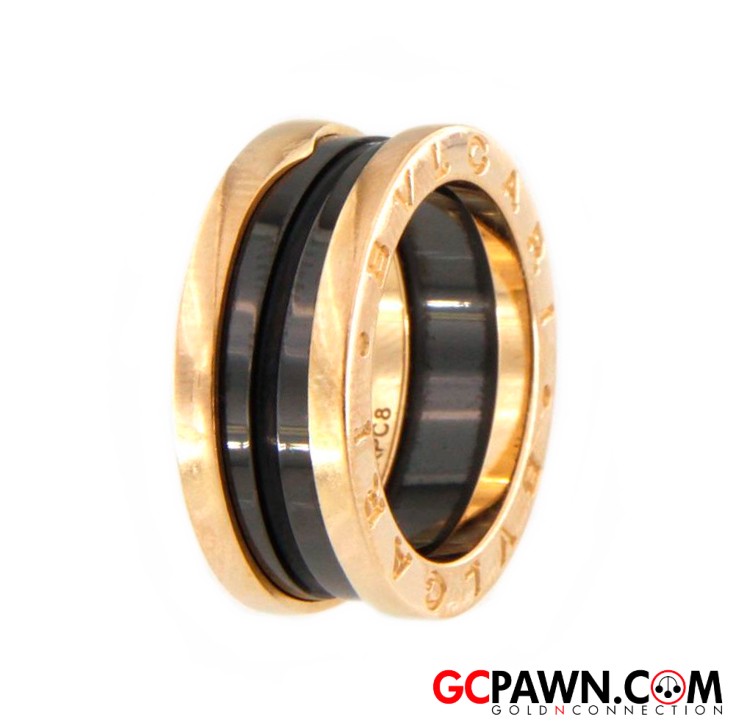 B.zero1 two-band ring with two 18kt rose gold loops and a black ceramic spiral. Comes with original box and paperwork